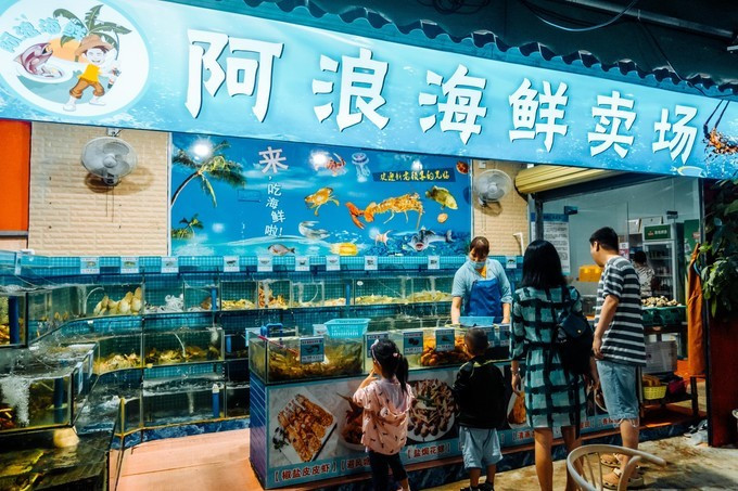 其实在椰梦长廊的街对面,就有很多的美食广场,我最先就是被这家蓝色主题的小海豚海鲜吸引了。