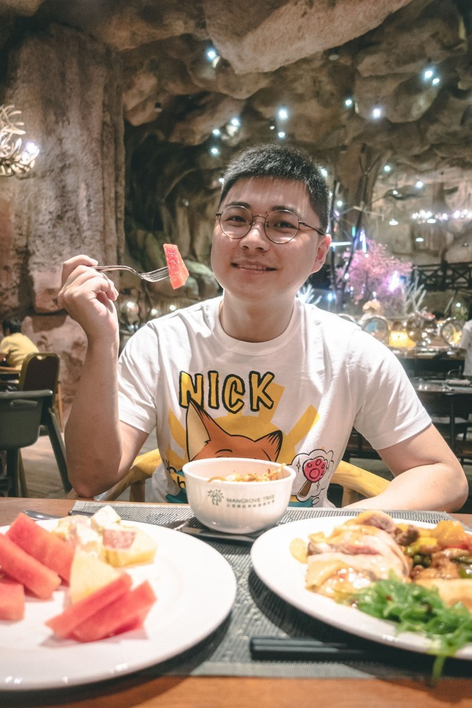 如果是吃饭的话,度假区里有KFC,星巴克等等连锁店,酒店本身也有招牌餐厅,像红树林火山餐厅可以吃到海鲜烧烤火锅自助大餐,也有一家独创海派的红树林网红烤鸭。
