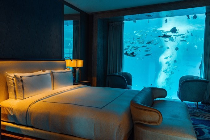 再往下一层,肯定会被震撼到,卧室的床正对着亚特兰蒂斯超大的水族箱,可以与8万多条海洋生物一起入眠,是不是很爽呢!