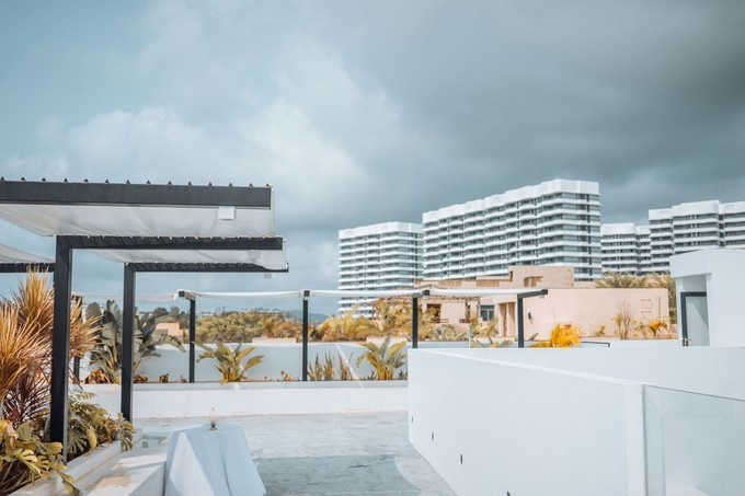 - 餐厅旁正对泳池的地方、泳池边的白色logo旁