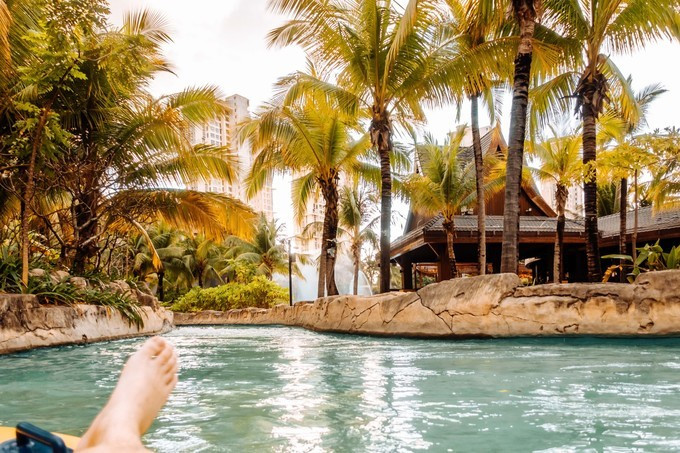 5、极速漂流河。漂流项目也是可以单人/双人游玩,中途会有几个激流速度较快,绕整个水世界转上一圈大概20分钟,所以我推荐最后游玩,会看到已经玩过的那些项目和亚特兰蒂斯酒店大楼,给自己的水世界行程收个尾。