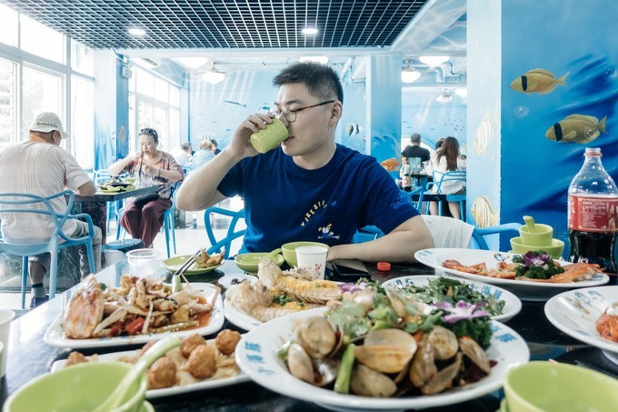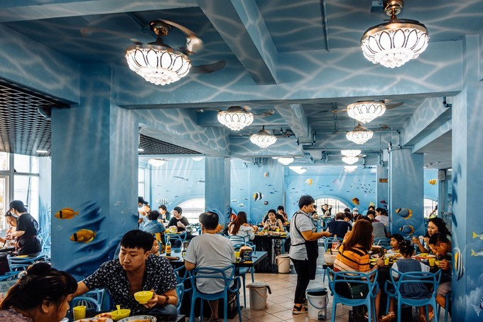 餐厅的内外部装饰,都是满满的蓝色海洋气息,感觉像是儿童乐园一样。所以餐厅里有很多一家子人来吃海鲜的。而且这家有特别福利,就是餐厅5km范围内的都能免费接送!我觉得这个相当方便,省时省力省钱。