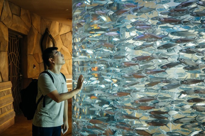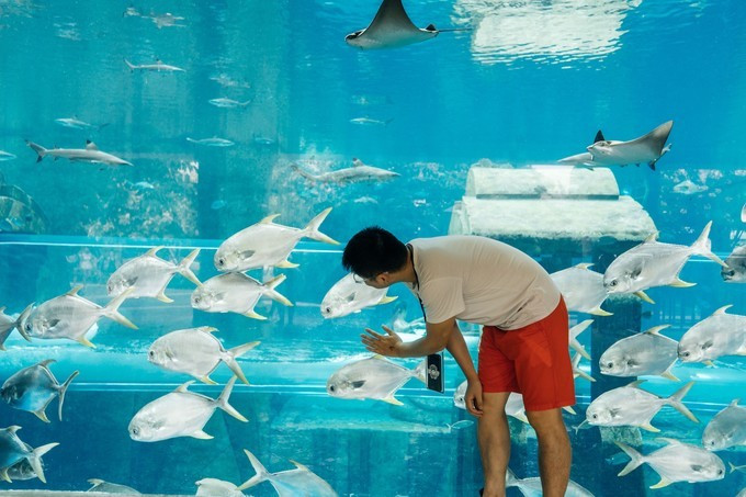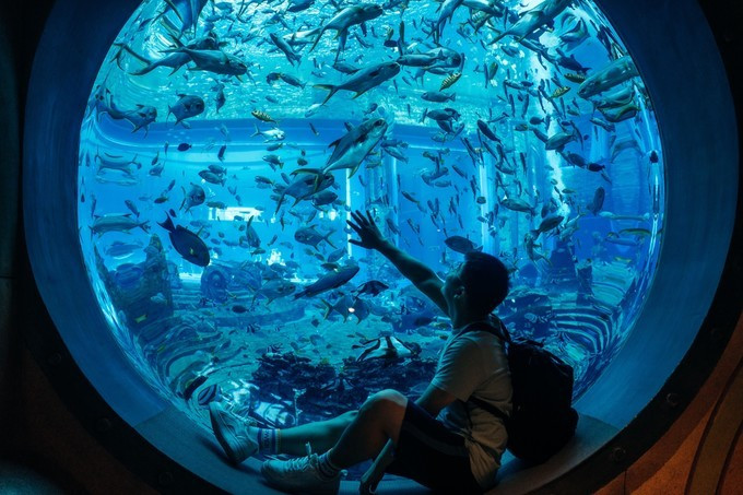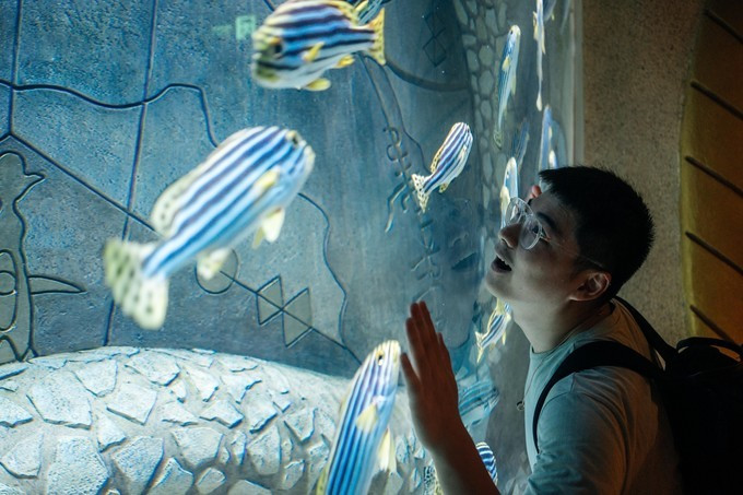 虽然水族馆没有那么大,但内部建筑营造出的亚特兰蒂斯的失落空间氛围很棒,像是走进了一个神秘世界,为你讲述关于海的故事。在这里可以和任意一个水族箱合照,尤其孩子们扒在幕墙上想和鱼类互动的时候,显得特别可爱,所以带孩子的父母一定要来打卡哦。