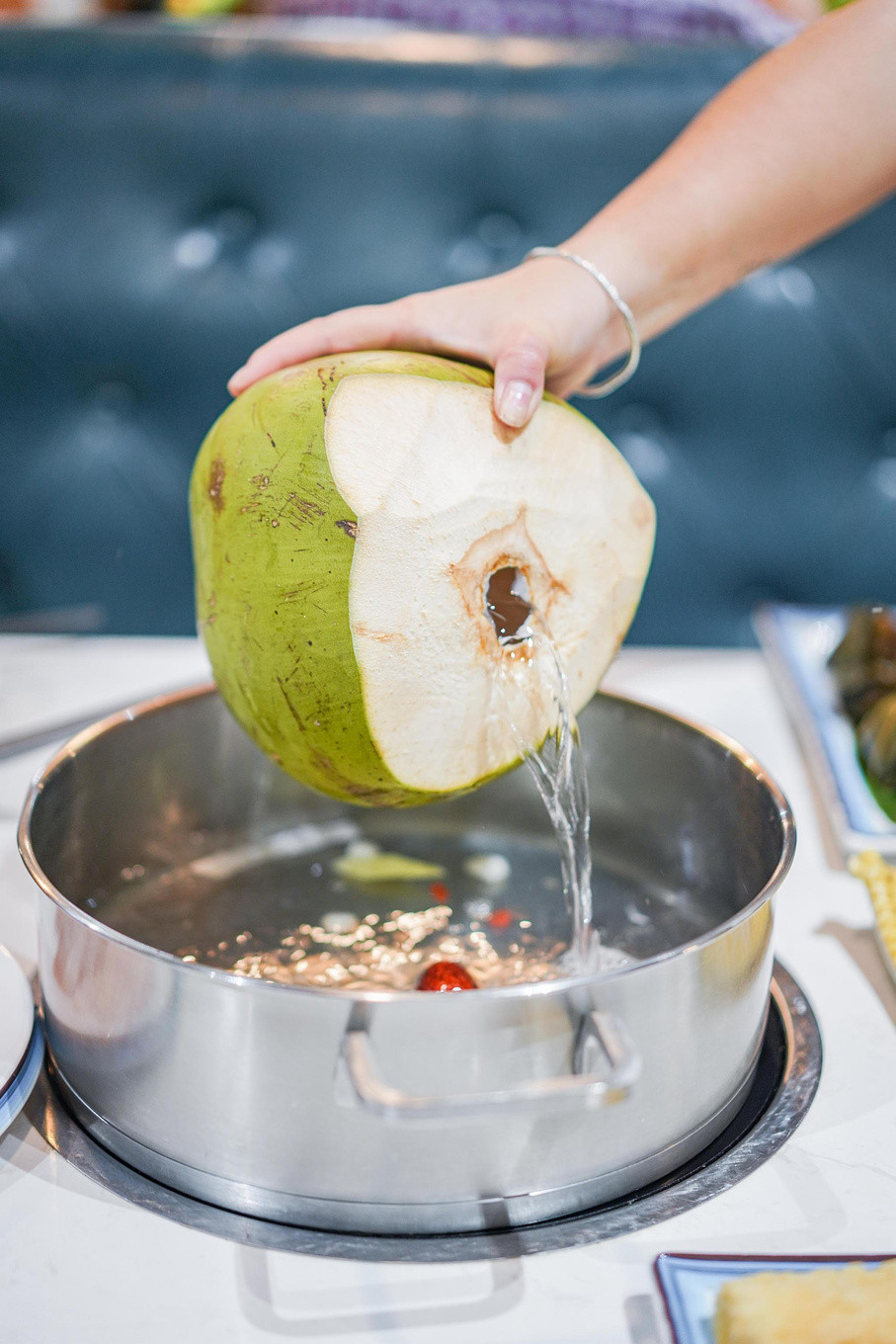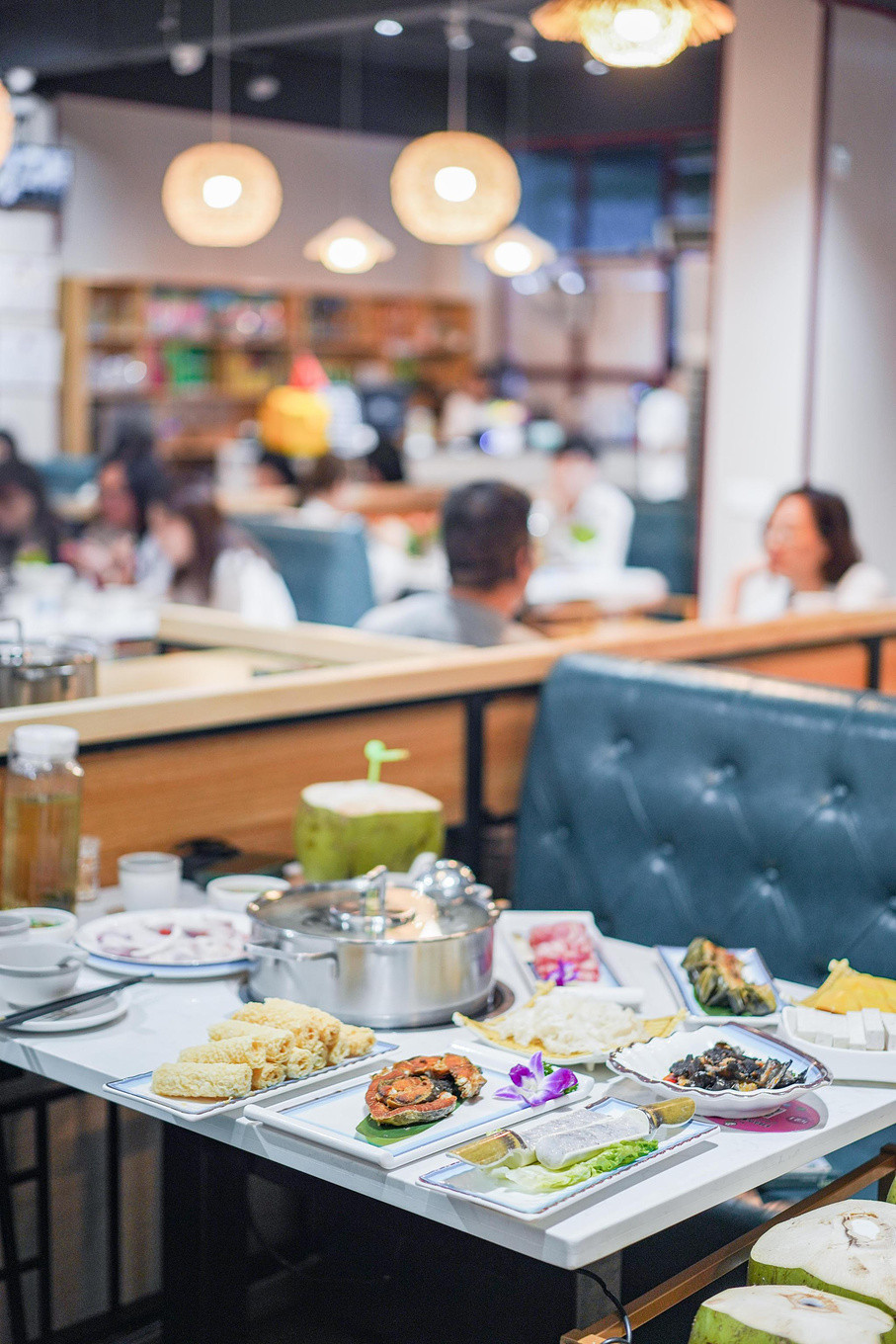 三亚的美食,除了海鲜,另一个让我心心念念要去吃的就是原汁原味的椰子鸡了, 三亚可谓是能吃到最正宗椰子鸡的地方,椰子鸡那么多,到底吃哪家?萌哒哒椰子鸡是我每次必吃的餐厅,他们家服务、出品、环境各方面都相当高。在亚龙湾的时候,刚好看到有一家亚龙湾店,赶紧来吃!首先锅底就非常棒,?3个椰子+?1瓶矿泉水,都是等客人上桌后再倒椰子水,新鲜看得见,新鲜椰子水甘甜清爽,用它煮出来的椰子鸡更是清甜。锅底还会添加马蹄、椰肉条、木瓜等,锅底非常清甜,吃之前记得先喝汤哟~椰子鸡椰子鸡,有了椰子怎么少的了鸡呢~椰子鸡里面的鸡是海南当地的文昌鸡,文昌鸡是散养着吃着椰林稻谷和椰肉长大的,非常的天然。新鲜的鸡肉倒入锅中,盖上锅盖大火煮三分钟即可食用,煮熟的鸡肉皮薄肉嫩,还带着淡淡的椰香,鲜美十足。吃椰子鸡记得配上海南风味的蘸酱哦,蘸酱可以自己调也可以叫店员帮忙调,他们调出来会更正宗。蘸酱主要是蒜蓉+沙姜+生姜+小米椒+酱油+一点点香油,然后加上酱汁的灵魂——小青橘,鸡肉蘸上这个酱汁,绝了!不管什么火锅,涮肥牛是必须的,鲜嫩的肥牛在清甜的汤中涮熟,是不一样是美味~手打虾滑也是火锅必备呀,虾肉看得见,吃起来的口感Q弹鲜甜,里面的虾肉很足,能吃到明显的虾肉,整个虾滑嫩滑鲜甜,让人欲罢不能。喜欢木瓜或者是想汤底更甜的小伙伴,可以点一份海南红木瓜,下锅煮熟后的木瓜使得汤底更加清甜,而木瓜的口感柔软清甜,简直是入口即化,超级推荐!海南香芋一定要点哦,香香糯糯的香芋,煮久也不会烂,反而更加软糯细腻,简直是老少皆宜的一道菜。还有很多的配菜,让人食指大动地响铃卷,又爽脆营养又高的绣球菌等等,好吃的实在太多啦,一定要去吃。安定猪肉粽是海南的特色哟,馅料超级多,香糯可口的糯米、咸香的蛋黄、紧致诱人的猪肉,每一口都好吃到爆。香煎马鲛鱼还是第一次吃,马鲛鱼煎得外焦里嫩,表皮金黄酥脆,内里细嫩鲜美,基本没有细的鱼骨,好吃到现在还念念不忘。酸辣无骨黑凤爪,喜欢吃辣的小伙伴可以来一份,爽脆酸辣开胃,无骨的鸡爪吃起来很方便,我觉得一份根本不够吃。我很喜欢他们店里的装修,是清新简约的风格,吊灯宛如一个小太阳,看着就心生暖意。服务很棒,无论是调调料,还是点餐建议,都很体贴细心,简直是有求必应,超棒!【觅食Tips】