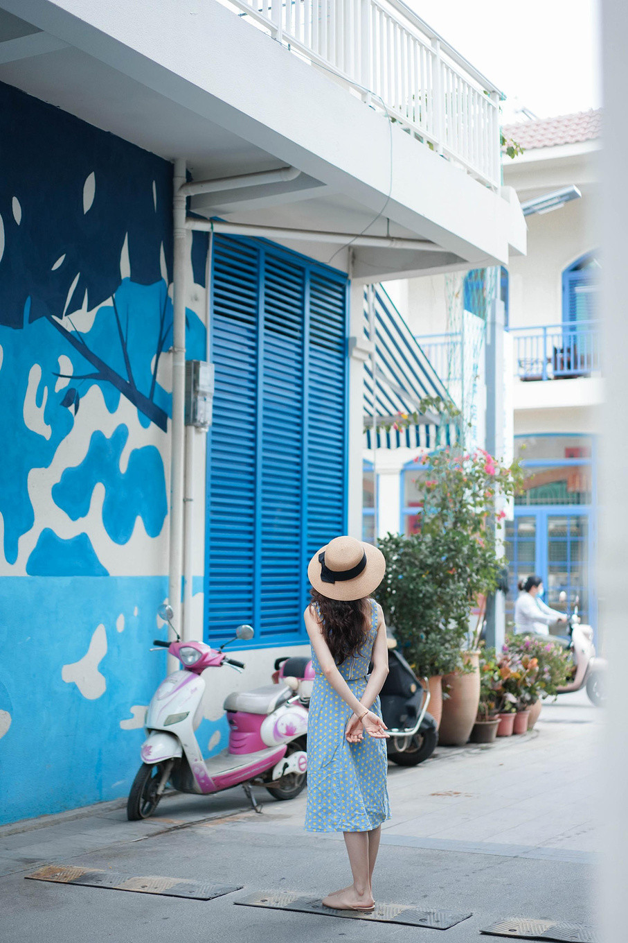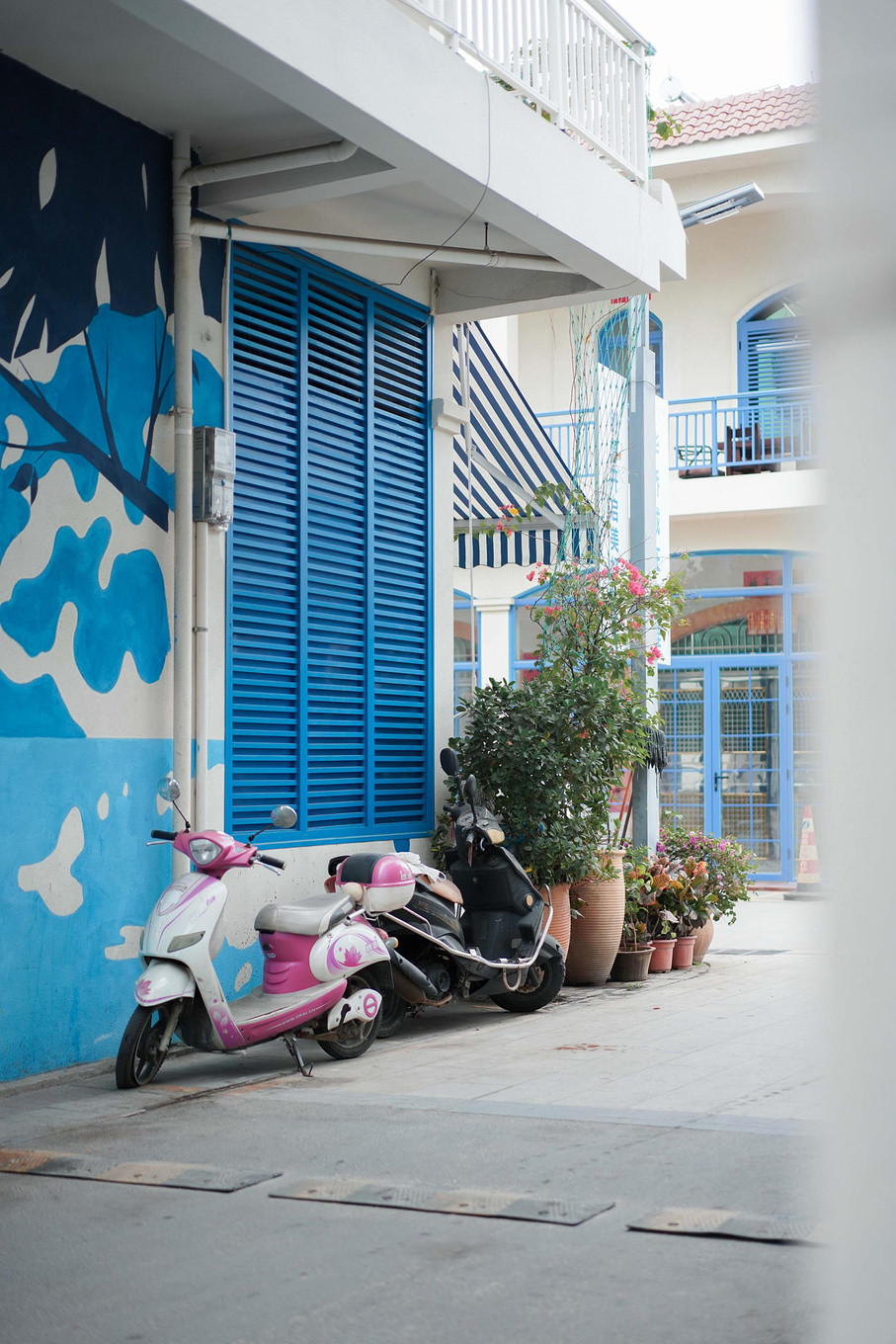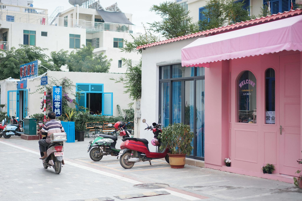 走进一个蓝白色的小镇是一种什么样的感觉?来天涯镇感受一下吧~从三亚市区打车过来,40分钟左右即可到达这个蓝白小镇。白色的房子、蓝色的窗户门扉、充满童真的壁画、门前屋后的花花草草,宛如一个童话世界。镇上的所有房子都是白色,门扉和格窗都刷上了蓝色,门前屋后都有许多花花草草,三三两两的电动车停在路边,偶尔有居民骑着车经过,整个小镇非常清新、温暖。这里被称为三亚的圣托尼里,因为到处都是白色的房子和蓝色的窗户,街道上都是这种蓝白风格的建筑,所以很容易拍出好看的照片。走在蓝白的小镇上,或驻目于花草前,或回望于转角处,或走过粉色的门扉前,随手一拍都是非常好看的照片。在这里,沿着街道慢慢闲逛,可能在转角邂逅一只小狗,也可能在街边偶遇衣服涂鸦,闲适而宁静。小镇的街道上有着很多涂鸦,或是色彩丰富,或是充满趣味,或是结合了各种的海洋元素,每一面墙都是不一样的惊喜,就连有些居民的门前都放着刚完成的画,整个小镇充满着艺术的气息。选一个自己喜欢的涂鸦去和它互动拍照吧,把自己融入这些充满趣味的涂鸦中,可以拍出非常有意思的照片。在小镇的时光格外闲适,当地居民的生活充满了安逸,在街上,经常能看到三三两两的老人在门口聊天,或是在自家门前售卖一小盆槟榔,或是在屋后修剪花草,每个人的生活都很平淡、幸福,实在是让我很羡慕,我也很想感受着挥霍时光的幸福感觉。小镇有5条主要街道,白龙街、黑龙街、红龙街、黄龙街和青龙街,沿着街道往里走,每一条街道走到尽头就能看见大海。沙滩上堆放着渔民们出海捕鱼的小渔船,毫无规则地错落堆放着,却有一种特别的美感。这时,不妨坐在渔船上拍个照吧~斑驳的渔船、灰蓝的天空、翻腾的海浪,有一种让人沉静的美感,那是时光的沉淀。沙滩边有很多客栈、餐厅,找一个临海而建的餐厅,安静坐着,看远处海浪翻卷,听海风拂过发间时的温柔呢喃,感受着时光的慢慢流淌,太舒服、太惬意了。【游玩Tips】