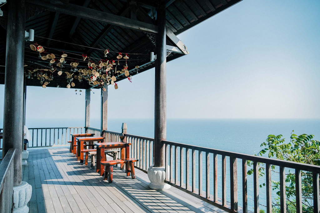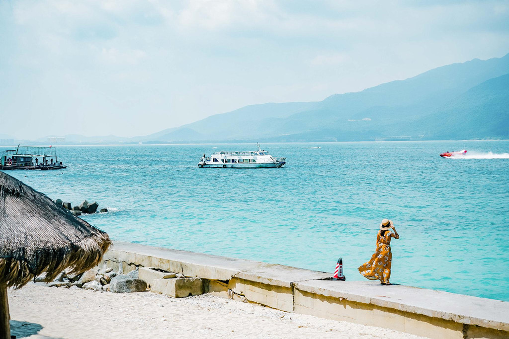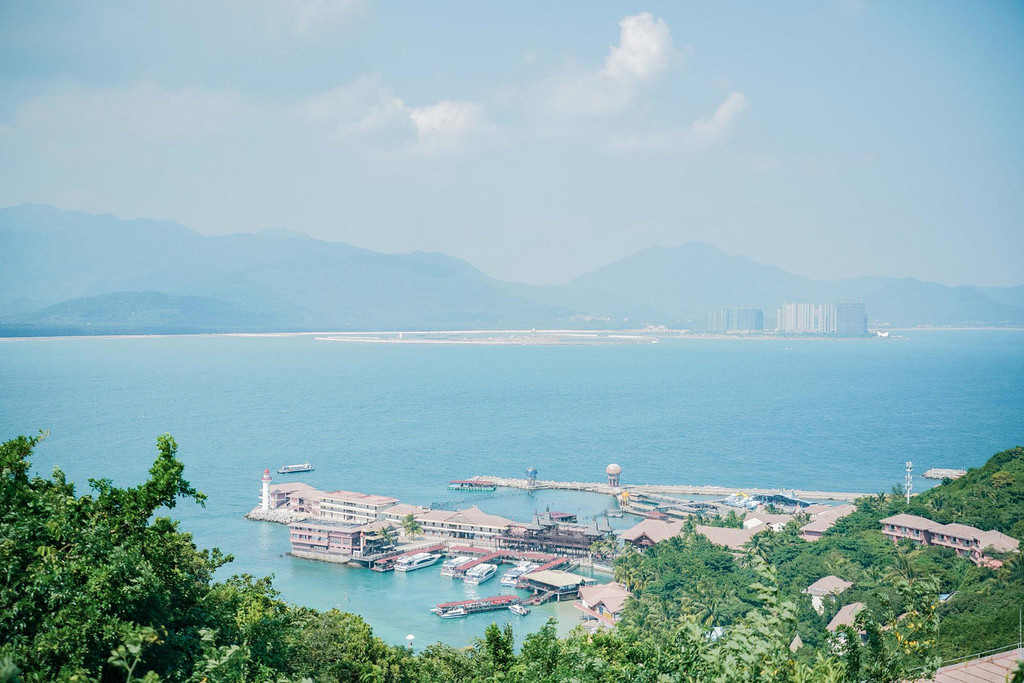 岛上门票淡季128元,旺季132元(淡旺季时间在后面),我建议报个一日游,我购买的是元138/人,包含了往返车费、上岛船票、门票,会在指定地点接,回程也是送到指定地点,非常方便和划算,想另外玩项目的话,可以再另行购买。船还没靠岸时候,就能看到岛上的美丽风景了。蓝天白天、阳光沙滩、清澈的海水,还有海边椰林里的休息椅,实在是太舒服了,看到的第一眼就想躺下去晒太阳吹海风!不过,岛上还有很多好看的风景没看过,怎么能就这么躺着不走了呢~进门不远处的海边有一条长长的石板栈道,栈道一侧是沙滩,另一侧是清澈的海水。我迫不及待走上栈道,迎着阳光,迎着海风,也迎来自己的好心情~岛上有个拍摄基地,有很多拍照道具,鸟巢、热气球,甚至是婚礼现场一般美的场景,有很多新人来这边拍婚纱照,洁白的婚纱、幸福的新人、远处的大海,构成一幅幸福的美好画面,使人看了也忍不住笑意满满。水上运动项目也非常多,如海钓、摩托艇、海上拖伞等,可以根据自己的喜好来选择游玩的项目哦。不过我们是慢慢逛逛看看的休闲玩法,在沙滩上玩够了,就坐上电瓶车一路上山,上山途中还会经过不同的点,可以每个点都下来看看哟。如果你要问我,哪个点最好看?当然是山顶啦!站在山顶的景观台往下俯瞰,远处是青山,青山脚下是城镇,城镇仿佛是从海水中长出来一般;近处也是山,海水拍打在山脚的岩石上,绽出朵朵浪花,俯瞰下去,更添了一份惊险。电瓶车车票是包含一张咖啡券,在山顶的咖啡店可以点一杯咖啡,坐在外面的桌子上,喝着咖啡,赏着无边的海景,这也太舒服了吧~山顶有很多休憩的地方,可以随便选一处心宜的坐下。这么美的地方,就适合什么都不做,静静看海吹风,荒废时光。岛上还有什么特产,充满着海南民族特色,可以选一些自己喜欢的带回去,也可以在餐厅吃吃东西休息休息,总之,在岛上的每一刻都是闲适的,非常适合度假。【游玩Tips】
