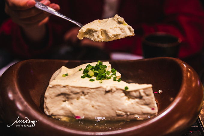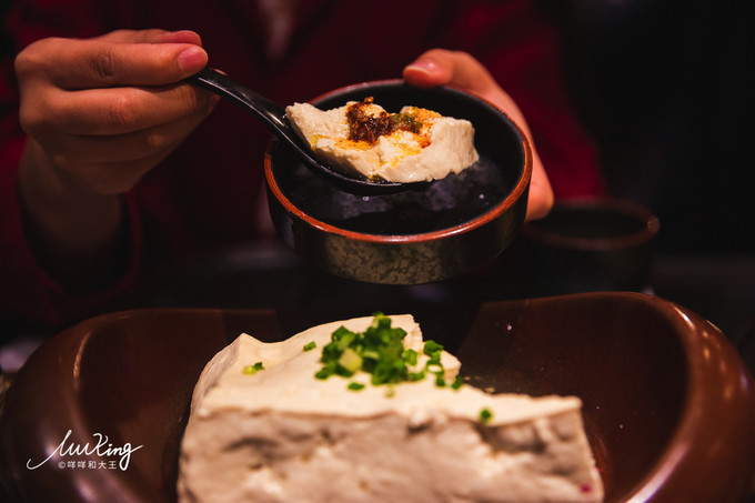 一块豆腐:他家的招牌菜,一块大豆腐,摆盘很用心,仙气满满。豆腐是用石磨现磨的,豆腐超级鲜嫩,一点豆腥味儿都没有,无论是单吃还是配上3种小料都很可口。