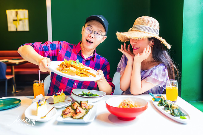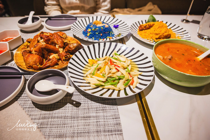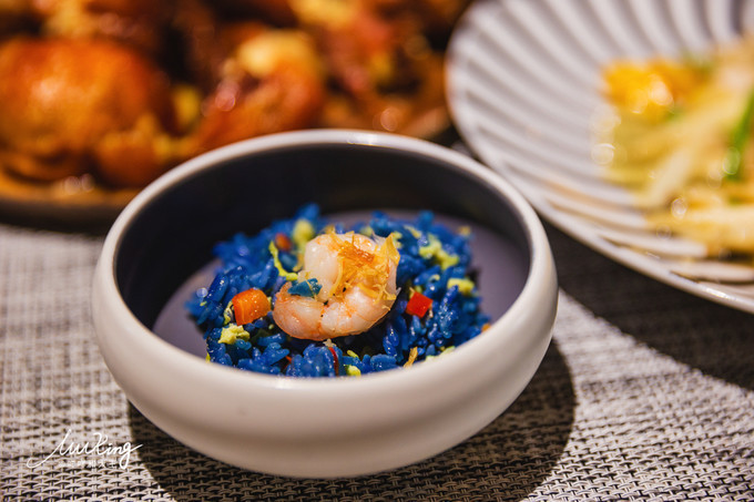 蓝色海洋炒饭:用蝶豆花的天然染色,蓝色米饭和虾仁的完美结合,鲜花做摆盘,很像一个精致的艺术品。