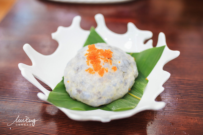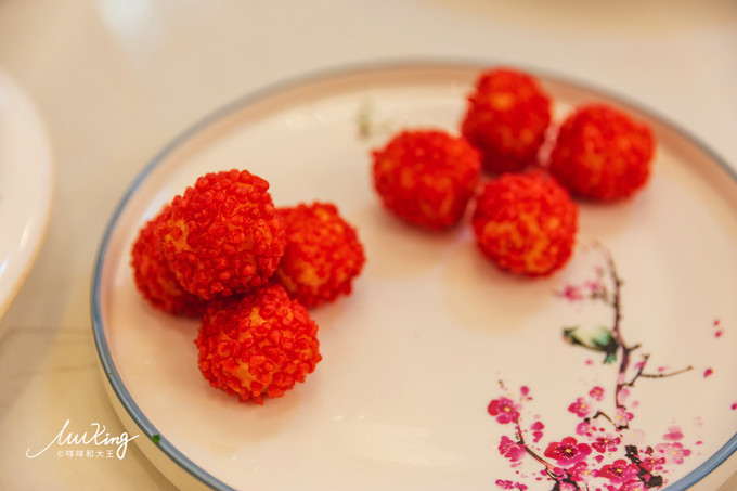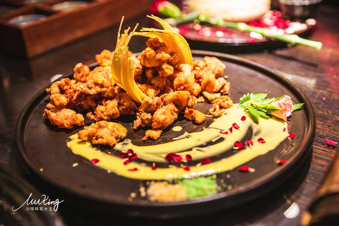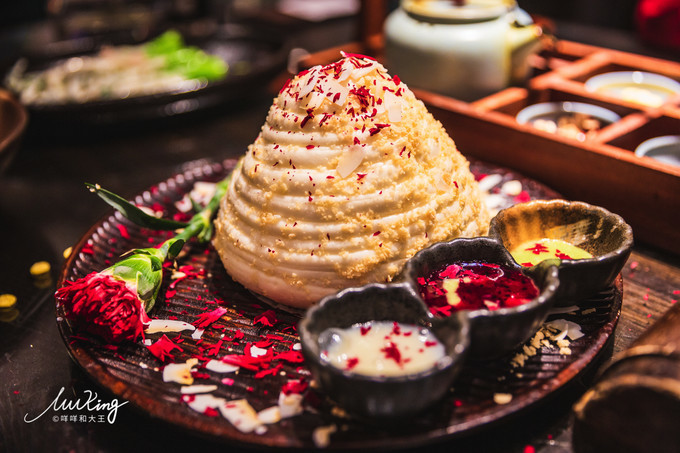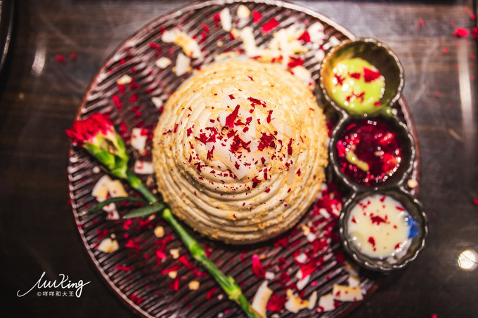 这道菜还有个小互动,服务员会把花朵放到干冰里速冻,自己用手把花朵拍碎,花瓣瞬间粉碎,少女心爆棚!花卷的造型像一个小山,椰奶味儿的花卷还是第一次吃,很有特色。还有椰奶酱、火龙果酱、牛油果酱可以蘸着吃。