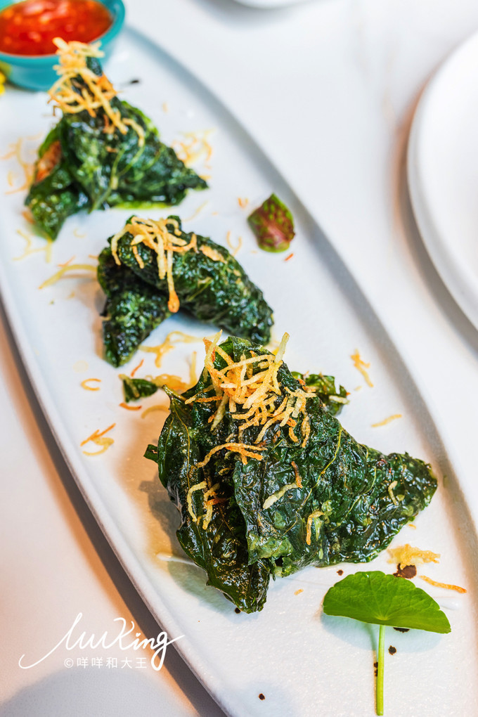 捞叶虾饼:紫苏叶包着超大块的虾肉,过油炸,外酥里嫩,蘸上 海南 特色的小料,很有 东南亚 风味。