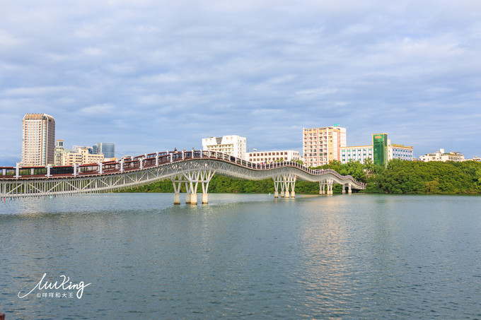 它是一座木面桥,建造于2004年,全长170米,高低起伏的白色桥廊远远看去像一条白龙横跨 三亚 河上,据说情侣们在桥上走一走就可以长长久久哦~