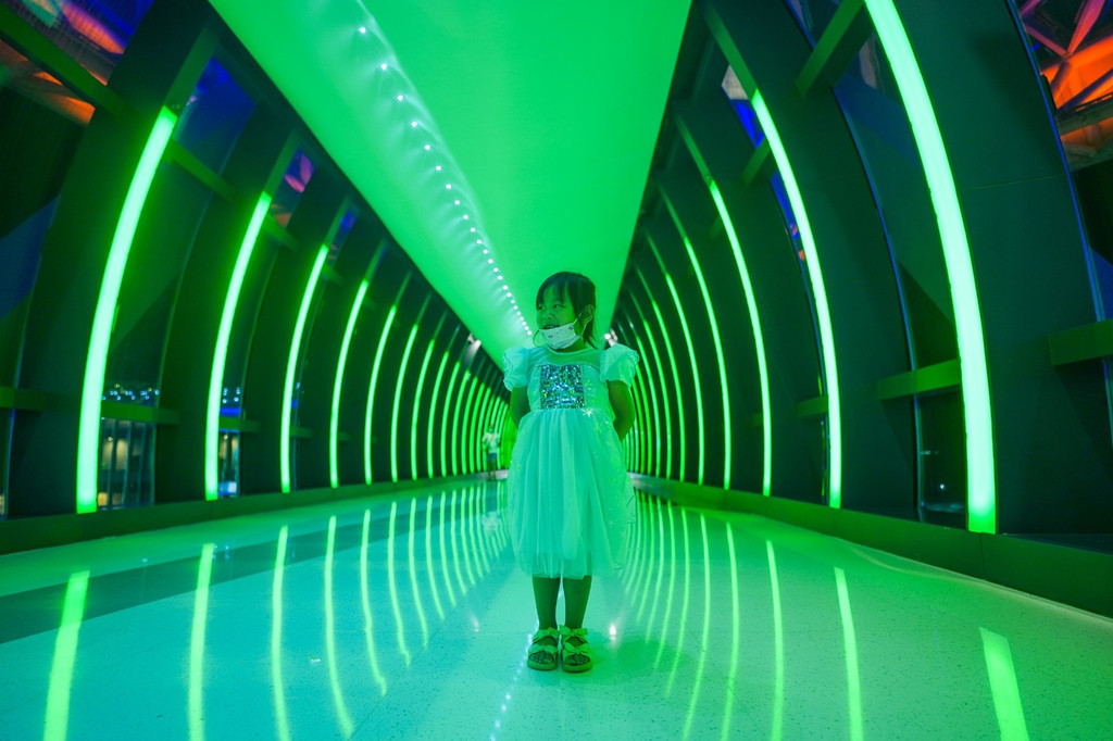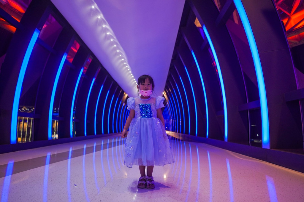 不过这次带小萌来,发现免税店的连廊晚上还挺好看的,跟时空隧道一样。