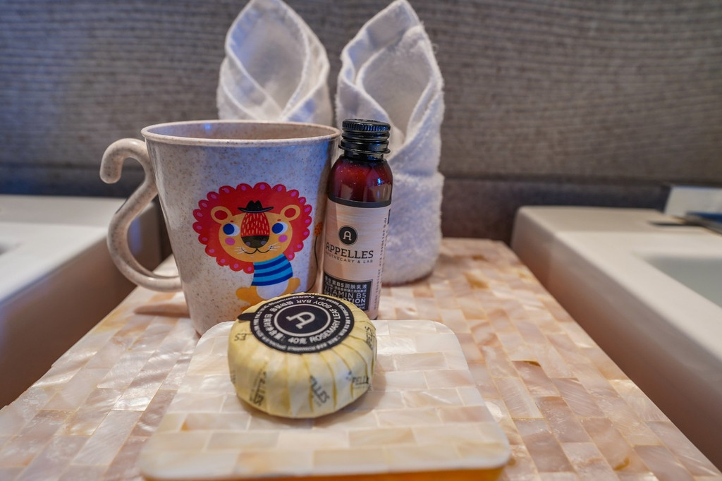 美高梅的logo是一头 狮子 ,连给小朋友准备的漱口杯也是可爱版的小 狮子 。