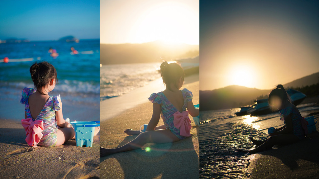 亚龙湾日落十分的光线也非常美,坐在沙滩上的小萌,逆光的剪影也那么可爱。