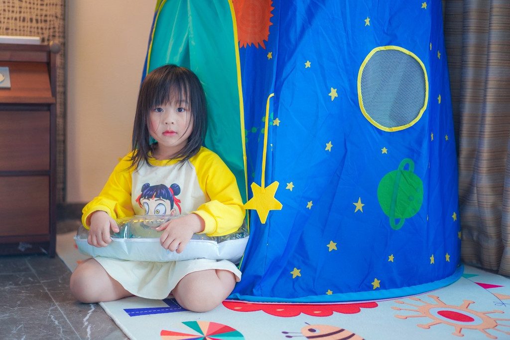 这一次我们预定的是美高梅的亲子大床房,房间布置的很温馨,还准备了一个小篮球框和小帐篷,张小萌一进房间,就兴奋的不得了,一股脑就钻进了小帐篷。