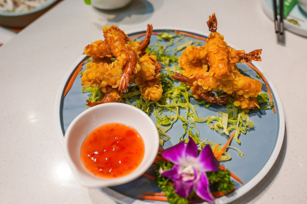 这个造型一看就是必点的招牌菜,一层层的虾球阶梯摆盘非常有创意,红通通的看起来也很有食欲,虾球外面炸的很酥脆,里面又保持了虾的嫩滑,而且虾个头超大。