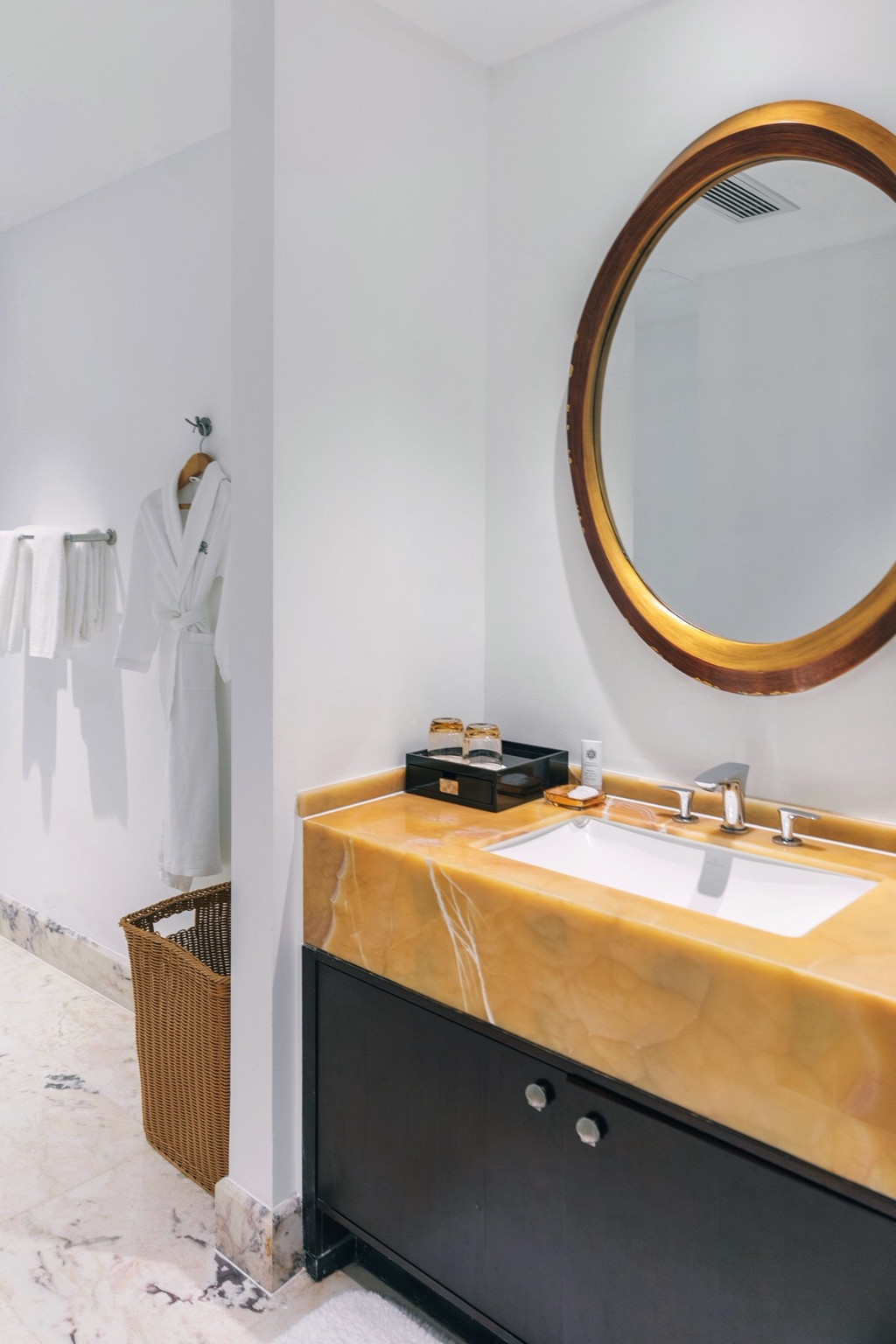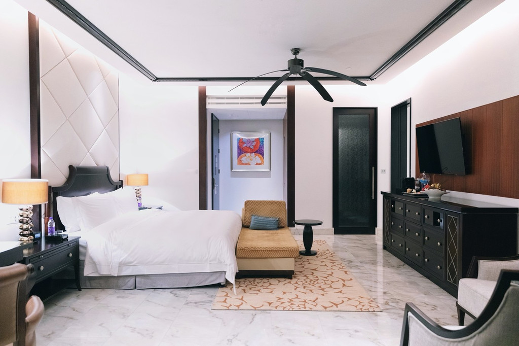 酒店客房品质极好,面积大,最小的客房也有70多平米,明亮的白色与温暖的橙色构成主调,红木家具与毛绒地毯使空间变得更加活泼。阳台宽敞,躺着看海非常惬意。