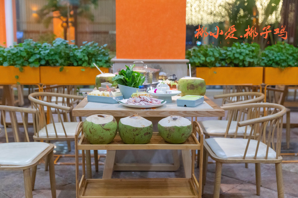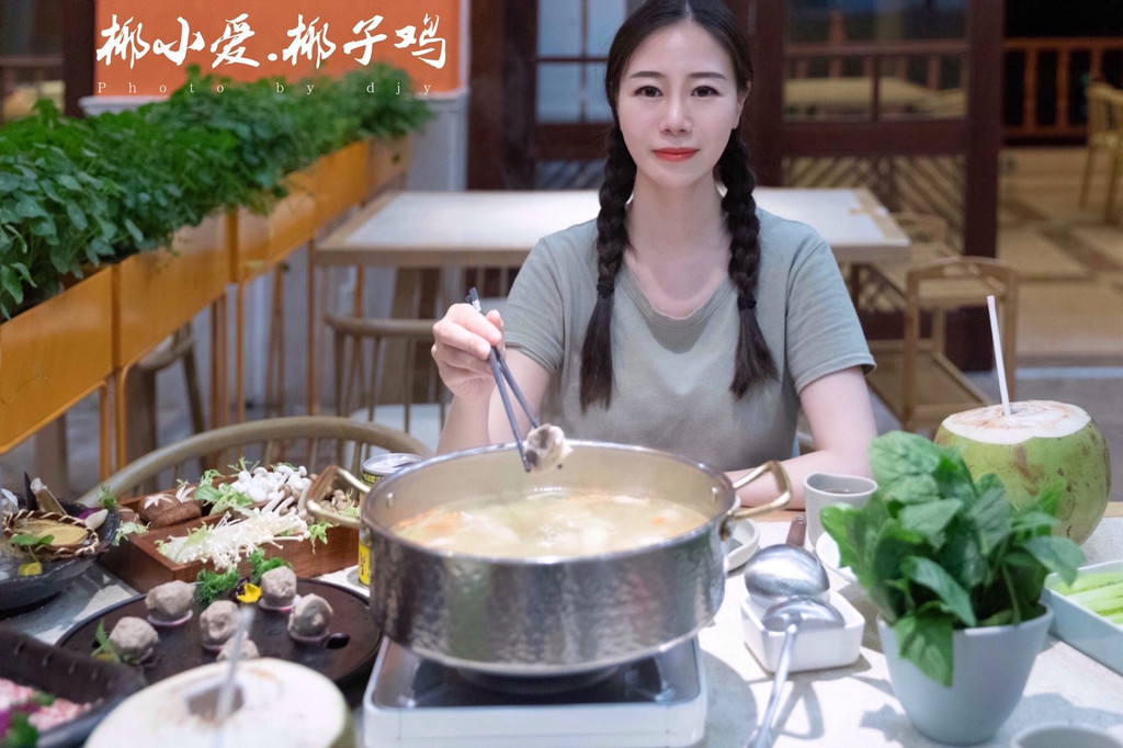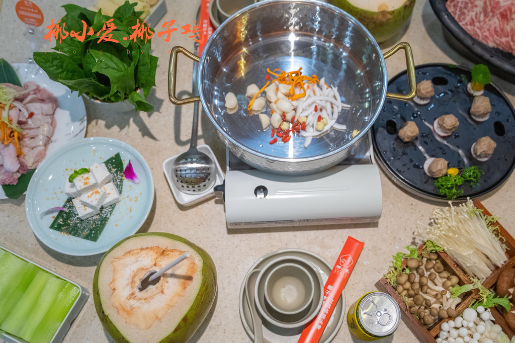 我们还没等点菜,就已经开启了拍照模式。店员来给我们做汤底,先是三个椰子,然后又倒入了椰树矿泉水。