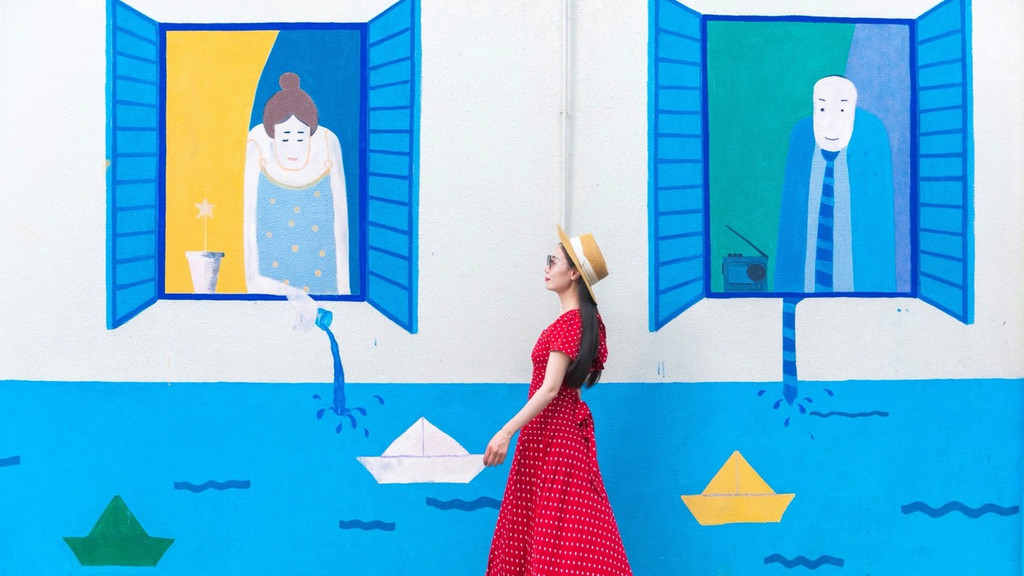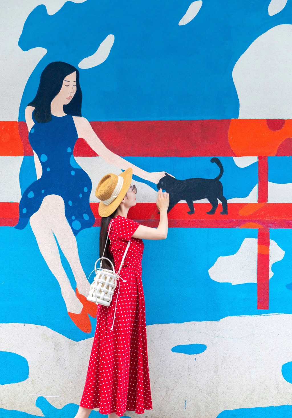 街道上有很多彩色的涂鸦,这些涂鸦都是跟海洋元素相结合的,每一面墙壁都非常好看,非常有特色。映着蓝天白云,穿行在小镇里的每一条小巷中,感觉像是走在了梦幻的蓝白世界。最惊喜的是,你永远猜不到下一个转角会遇到怎样的风景。