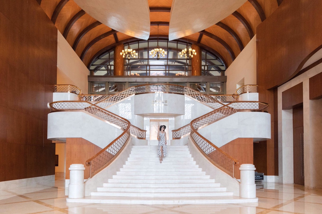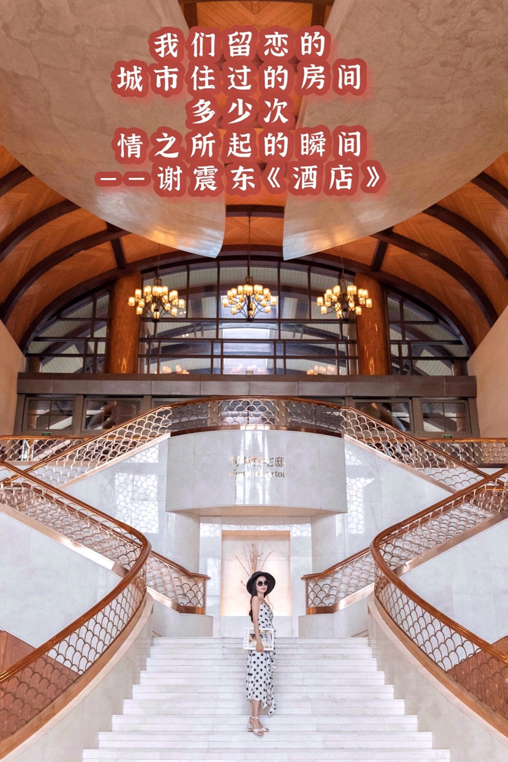 阿斯特客厅的楼梯是酒店的一个网红点,玫瑰金色的楼梯扶手,对称的线条设计,典雅时尚,旋转的楼梯和吊灯,ins风大片说来就来。