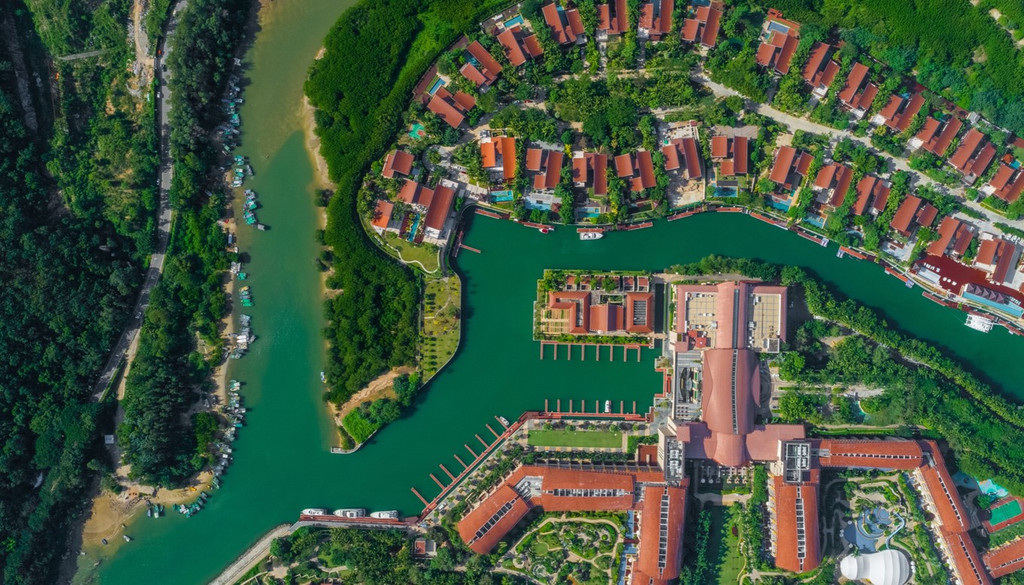 作为中粮集团投 资兴 建的奢华酒店,亚龙湾瑞吉度假酒店地理位置相当好,它毗邻国家珍稀植物红树林保护区,小河环绕,大海拥抱,海天一色,风景绝美。