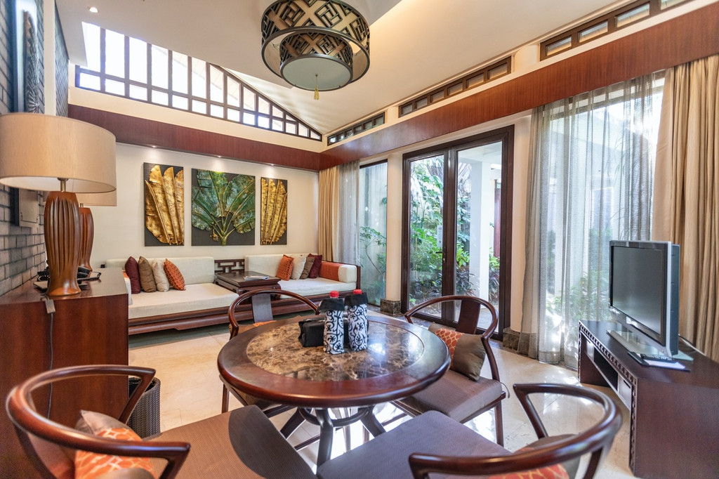 泳池别墅内部很宽敞,颇具现代感。采用当地特有材质打造红瓦屋顶和黑色石板墙,融合当地独有的热带风情,细节之处尽显 中国 意韵。