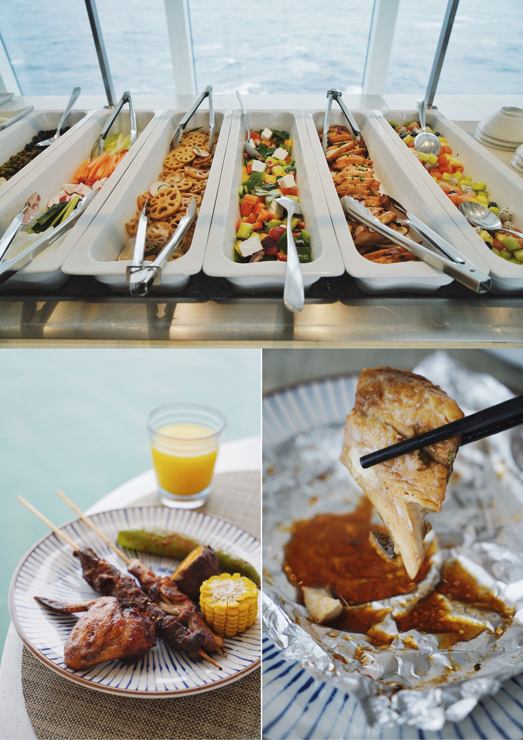 伊敦号船上不仅有N多美食,还有不同的小食点心和下午茶。我们在中央泳池玩水玩累了就在池畔烧烤吃个池边BBQ,有羊肉串、牛肉串、鸡肉串、汉堡包、特色面吧等选则,还有鲜嫩多汁的烤海鲈鱼哈。