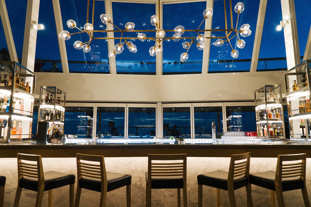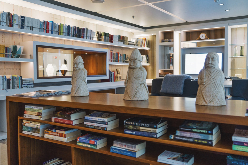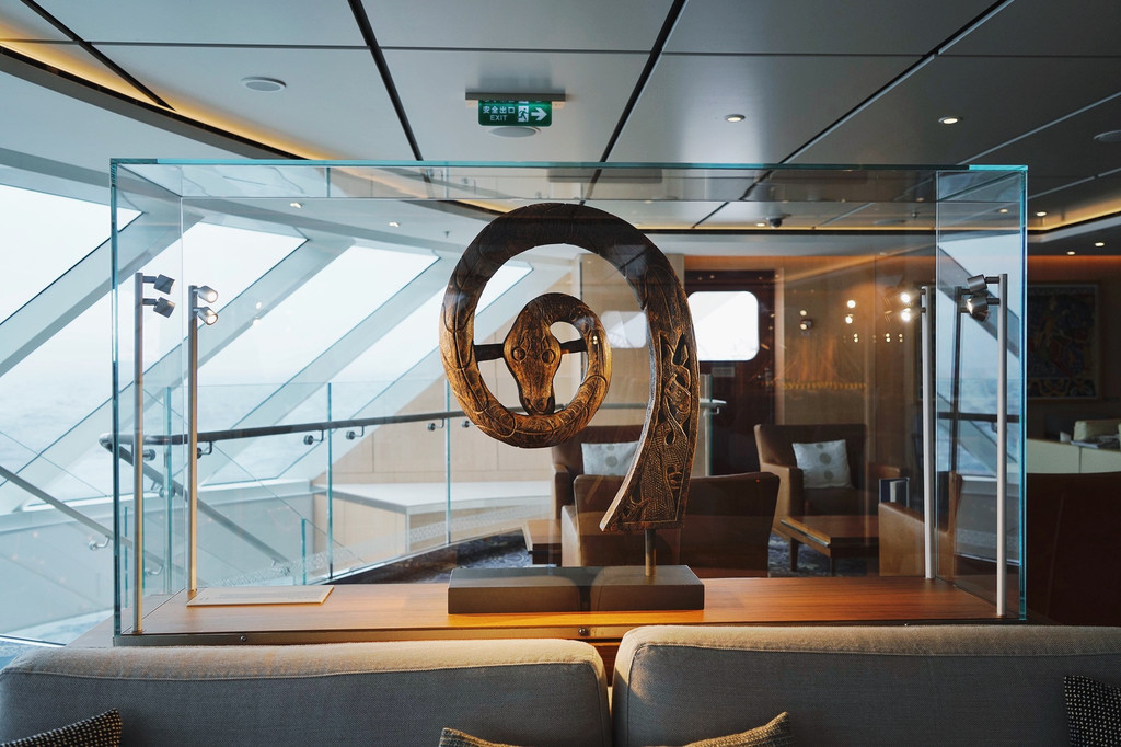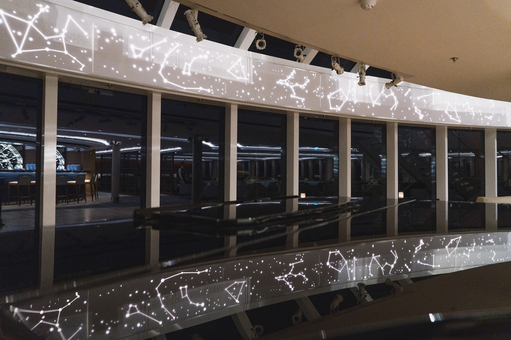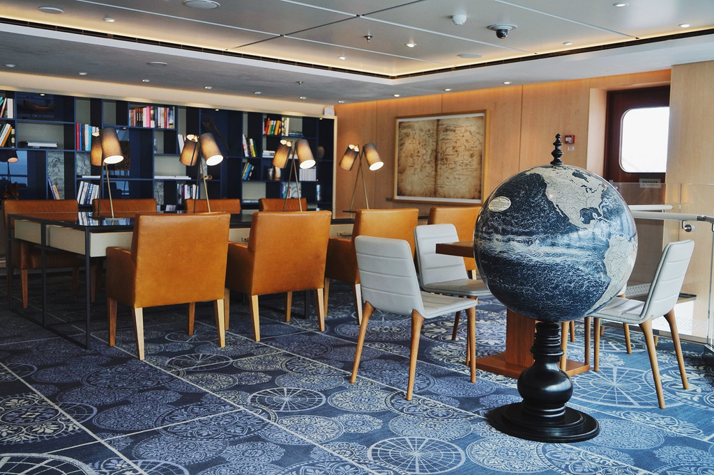 船上有4个酒吧,但我最爱的还是探索者酒吧,这里还是个小型的维京博物馆,2017年它还是太阳号的时候曾经停靠过上海,有幸登船参观了一次,那个时候就对这个酒吧印象深刻。书架上摆放了许多北欧收集来的航海老物件,白天可以在这里眺望大海,晚上可以来这儿找找自己的星座,调酒师还是原来那个酷酷的姑娘,可以来试试她的苦瓜特调。