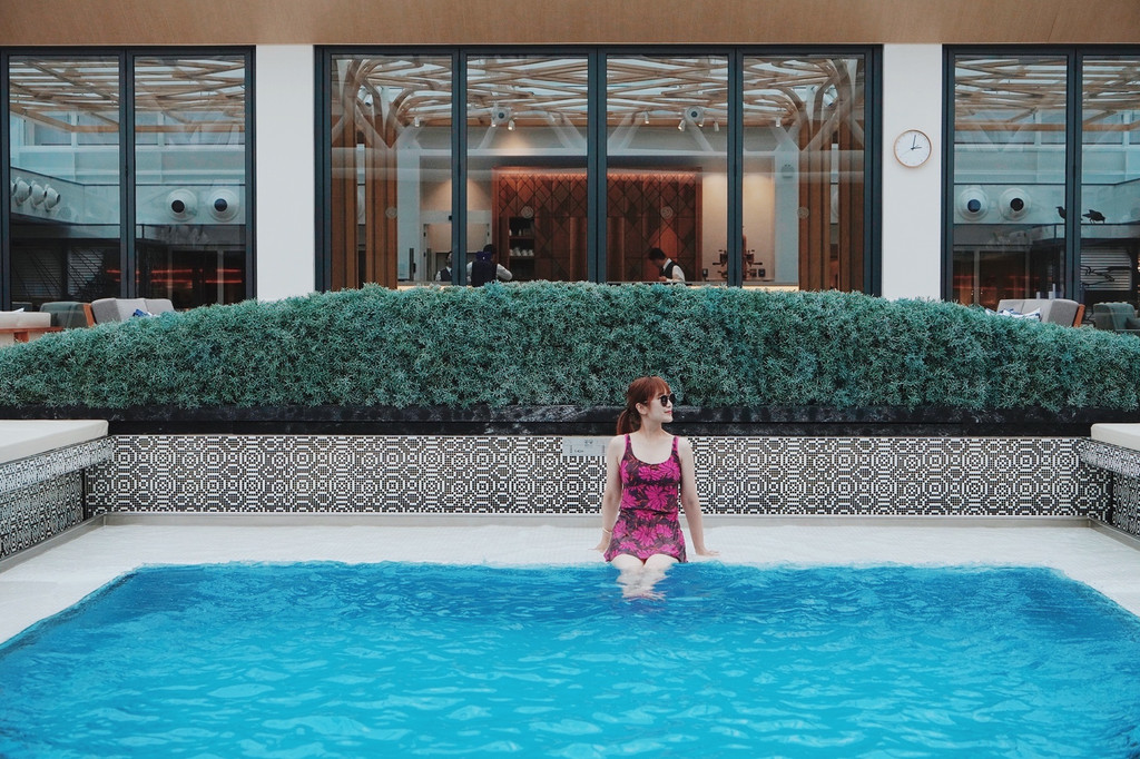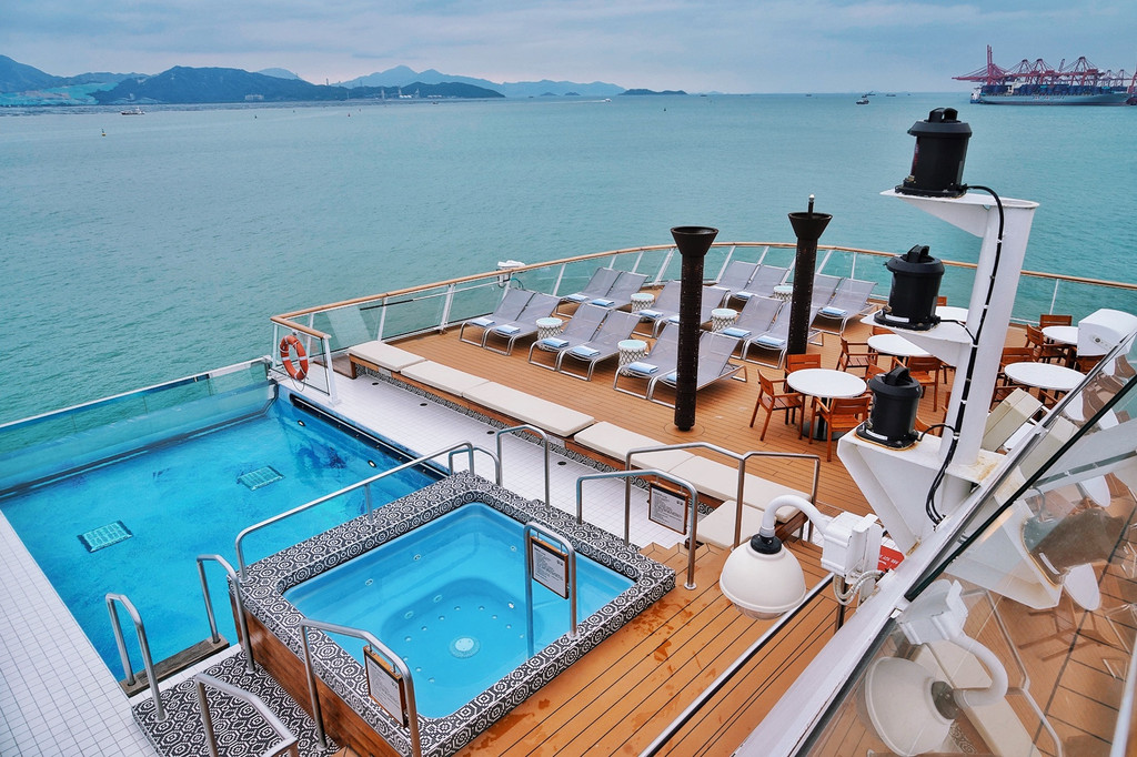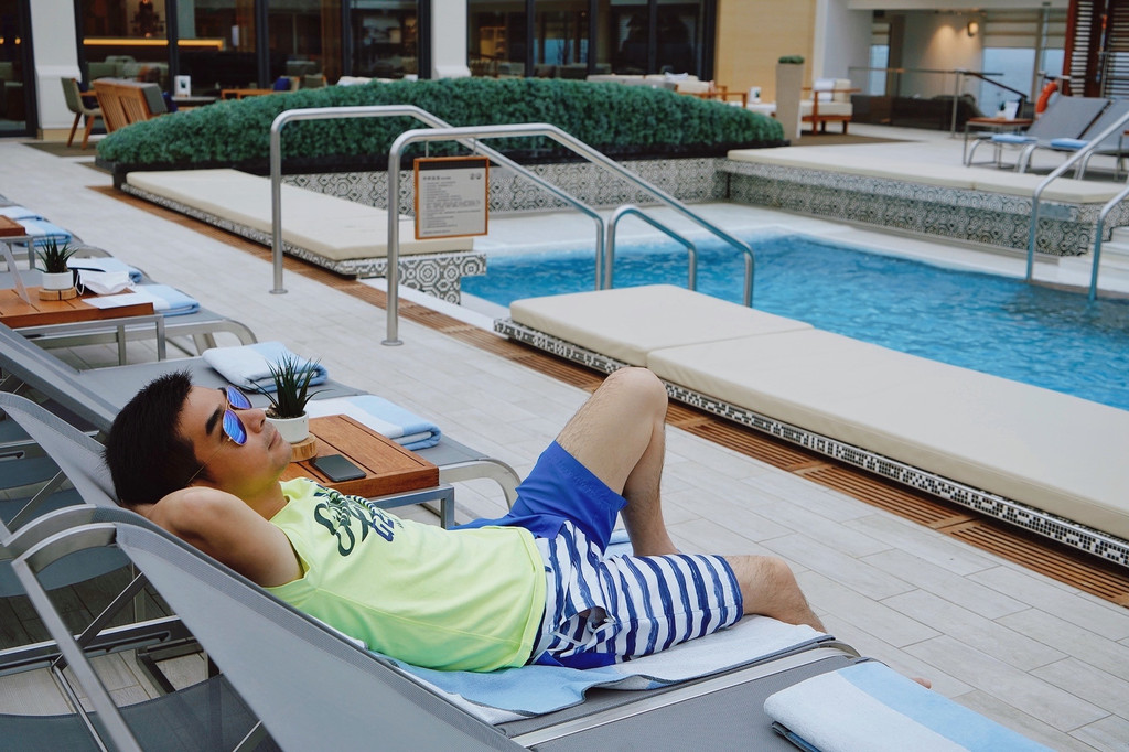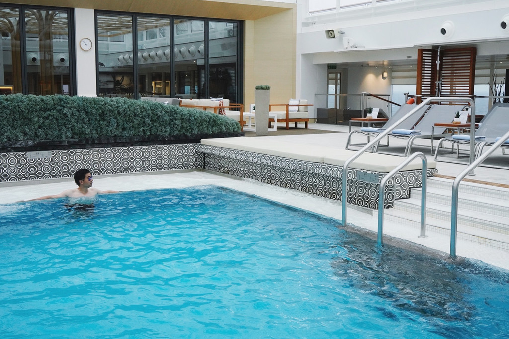 船上一共有三个地方可以享受玩水的乐趣,一个是观景露台的无边泳池,航海日在这里游泳,伴随着翻滚的浪花,让人仿佛置身于大海里游泳。