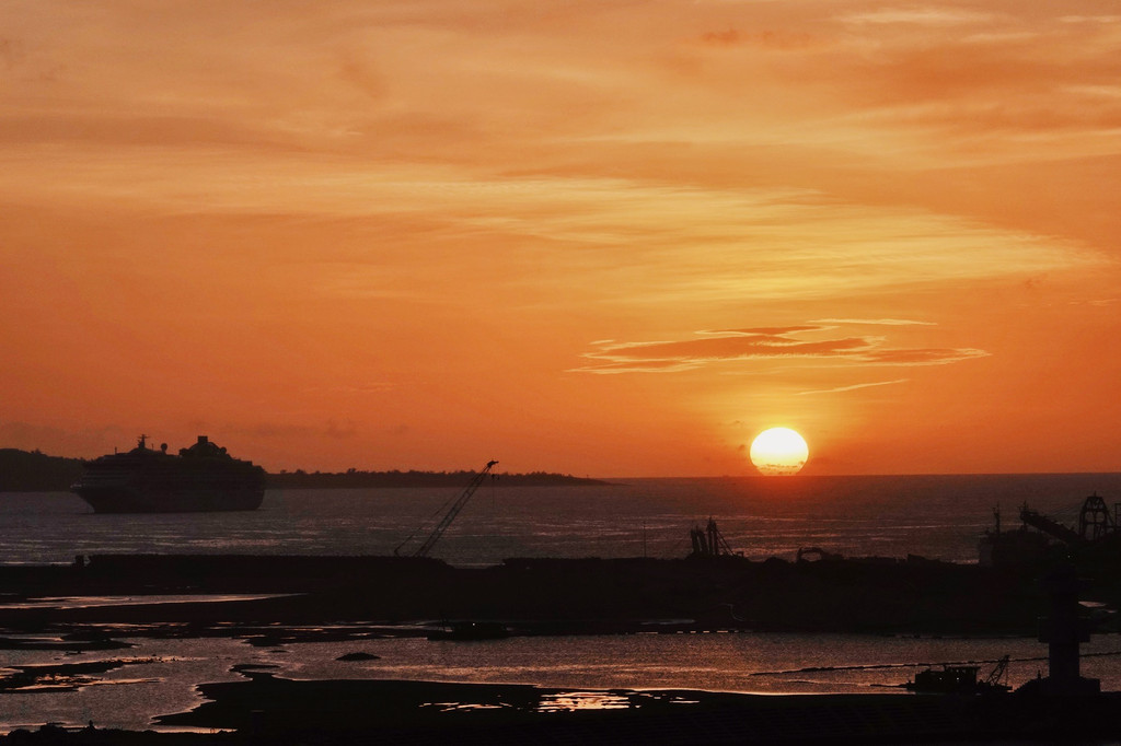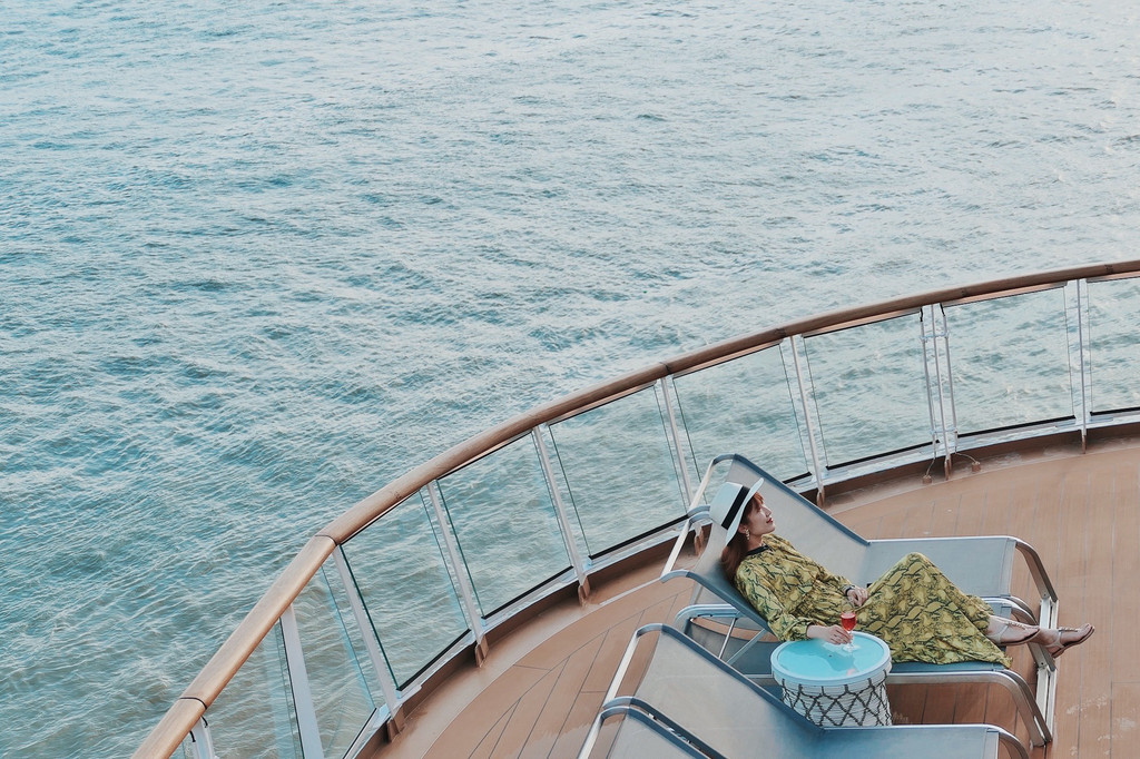 日落时分,夕阳洒在海面上,点上一杯香杯在甲板上欣赏绝美的海上日落。