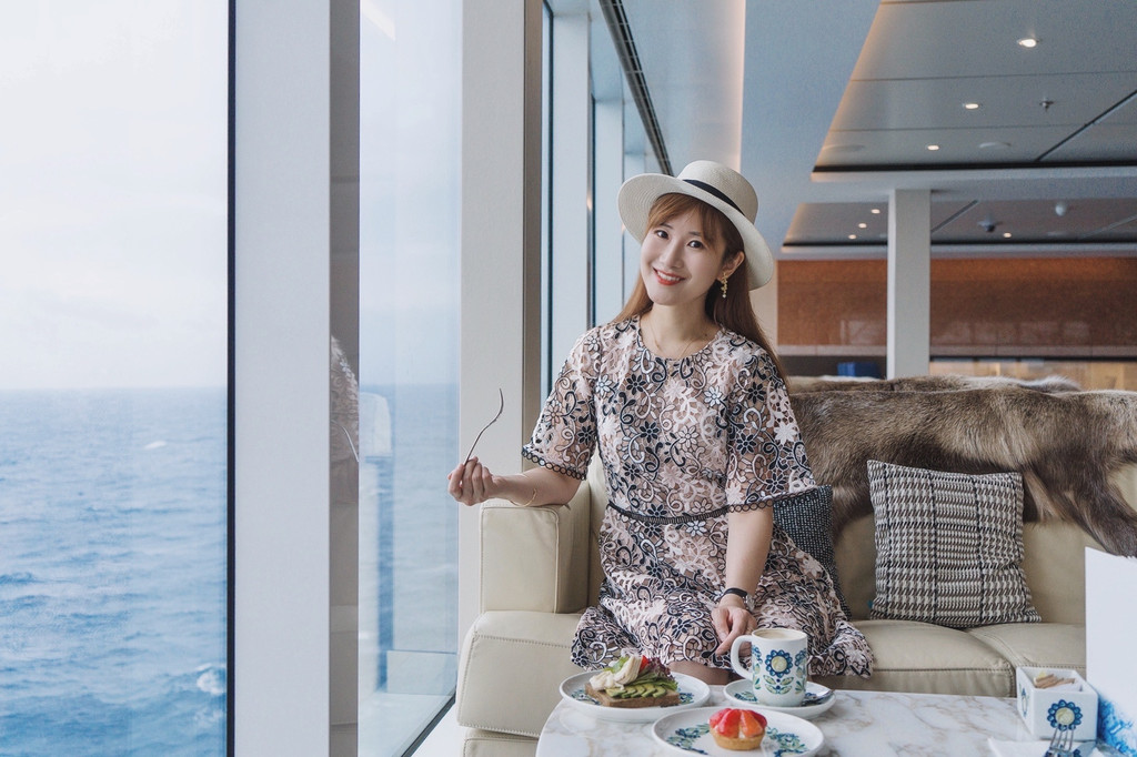 北欧点心连通船头的探险家酒廊区域非常出片,在这里可以眺望一望无垠的大海,感受在海上乘风破浪航行的畅快。