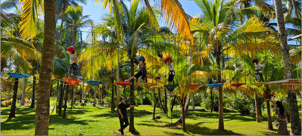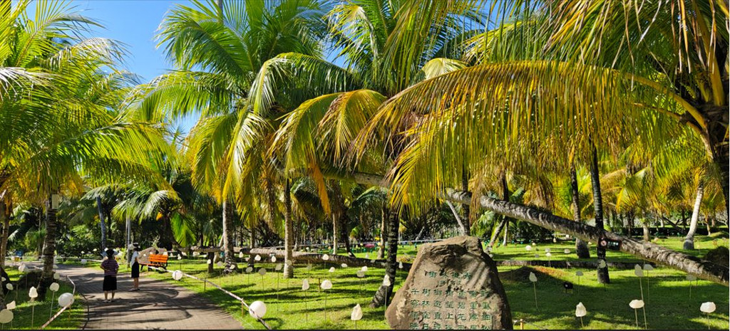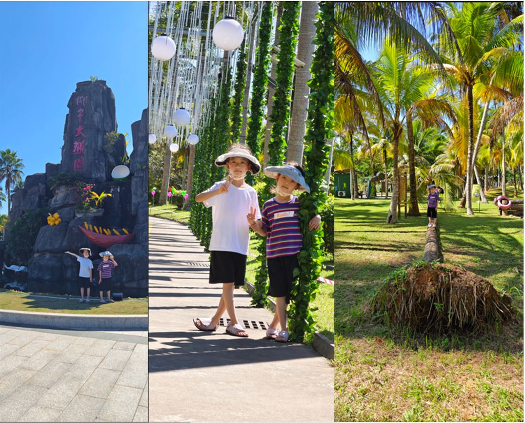 我们没有去东郊椰林和铜鼓岭,第二天倒是带孩子去了距离酒店很近的椰子大观园。园门口小池里有很多蝌蚪和小鱼,孩子们兴致勃勃玩了一会就进园了。这里其实是一处公园,园内有一些长得很奇特的椰子树。有的根部基本全部裸露在地面,有的直接长成了近乎90度弯曲的形状。园内还有一些攀爬娱乐项目,小朋友都很喜欢。虽然在任何一个城市都能很容易找到这些娱乐项目,但孩子们在蓝天白云椰树林下玩耍的感觉还是很不一样!