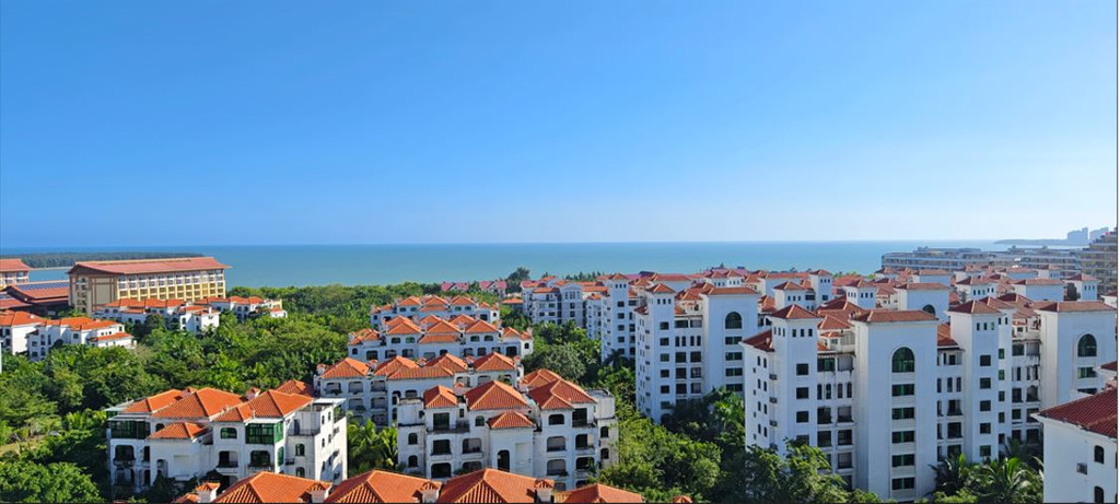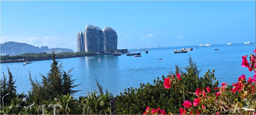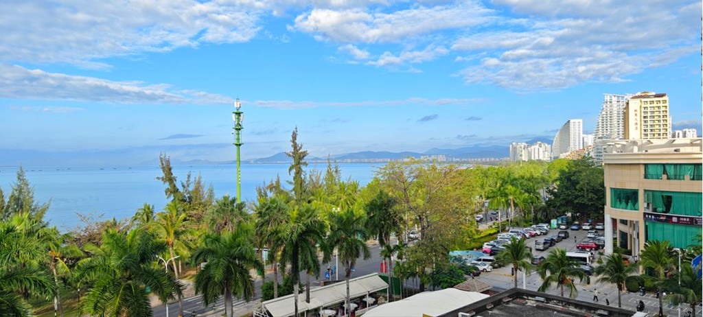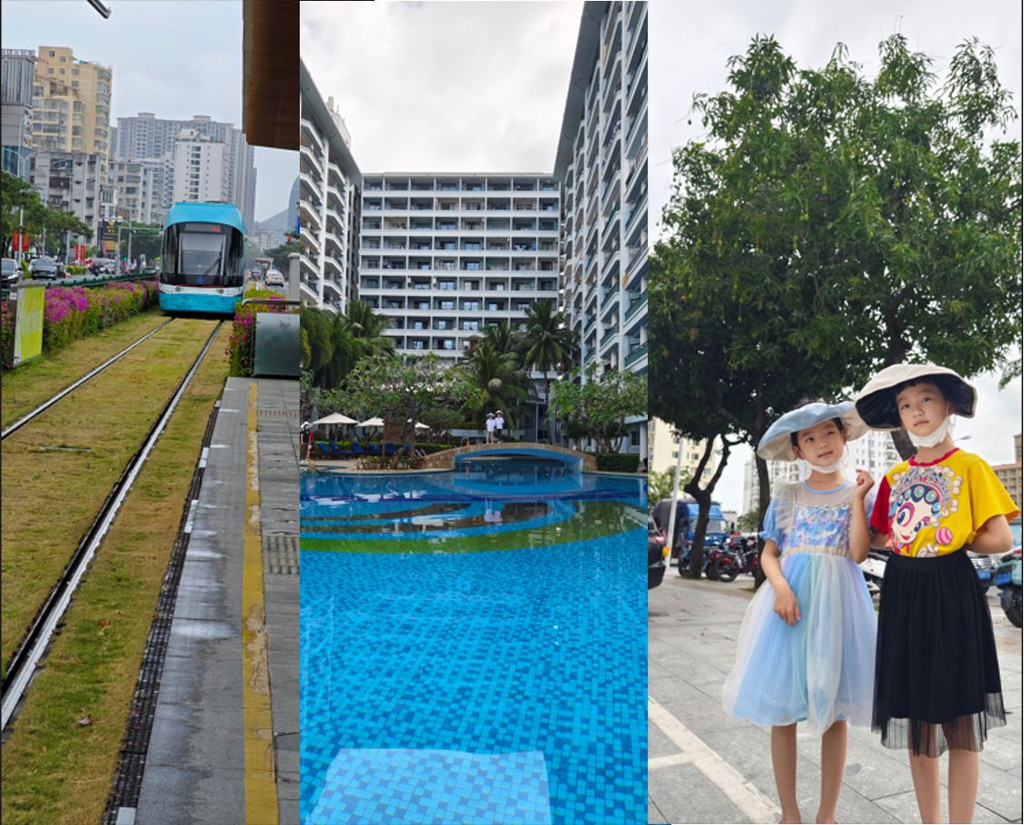 三亚是我们最熟悉的地方了,海口和东方天气还比较凉,到了三亚就不一样了,大家可以直接短袖短裤了。三年前三亚在建的有轨铁路已经运行,出了高铁站可以直接乘有轨电车去酒店,这是我们第一次乘坐城市里的有轨电车,孩子们都很兴奋。这个电车相当于一列小型地铁,速度不是很快但很稳。几十分钟后就到了我们入住的三亚湾天泽海韵度假酒店,酒店每个房间都有一个很大的阳台,适合看风景和晾晒衣服,整个酒店建筑也很特别,早餐就那样吧,不能说差也说不上好在哪里。