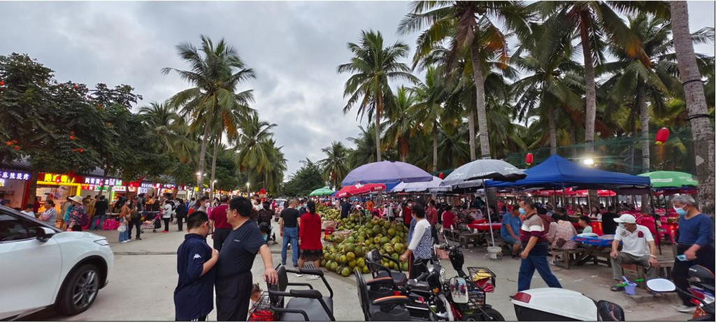 离开三亚我们来到了环岛游的最后一站-文昌,文昌的温度基本和三亚一样,但海边风有些大稍微凉一点,孩子们依然是短袖短裤。每到一个新地方大家都有些兴奋,文昌给人第一感觉是这里满眼都是椰子树,东郊椰林就在这里,据说海南一半的椰子都产自文昌。文昌虽然是个小城,但能感觉到它的着青春活力!顺便提一下,文昌街上有很多房产中介,这是我们在海南其它城市看不到的,足以见得这里房地产业火热。这里也不同于其它海南城市东北人居多,而是四川重庆人居多。我们入住的是高隆湾金石商务酒店,房间设有客厅,还有一个比较大的阳台,美丽的高隆湾就在眼前,蓝天,椰树,大海,橙红色屋顶的房子,感觉很不一样!这里早餐也比较精致,之前并不了解文昌,心想选对地方了!简单收拾下,让孩子们带上沙滩玩具就去海边了,这里的沙滩和别处不同,海滩很宽而且有娱乐越野车,所以整个海滩不全都是松软的沙子,中间部分仿佛被压出来一条宽宽的马路。高隆湾的海浪比三亚湾大,但还是有不少人在游泳,大海是美丽的深蓝色,整个海滩没有三亚湾那么热闹但人也不少。前面不远处还有一座伸向大海的木桥。海滩上小螃蟹很多,这是孩子们最喜欢的。不知不觉天色渐晚,晚饭哪里解决呢?高隆湾入口处就是一个繁华热闹的去处,这里门店一家挨一家,烧烤,小吃,海鲜等应有尽有,椰子也是一堆一堆的。整个地方就是一个人气满满的美食广场,充满了人间烟火味!食欲瞬间就来了,不过消费还真不低!