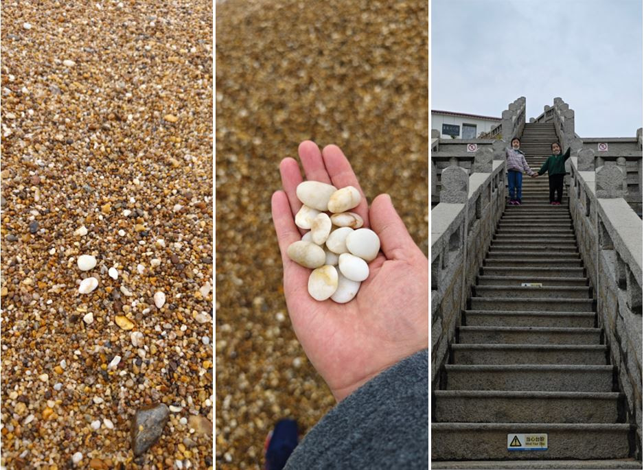 这里是海南岛的西海岸,不同于东海岸,西海岸比较原始,海边的沙子不像东海岸那么细,而是由小砂石组成,所以孩子们可以在海滩边捡到很多小石头。这些小石头看起来不是普通的石头,而是被海水打磨得很光滑甚至有点晶莹剔透,可以称作玉石了。我也被这些洁白透亮的小石头吸引,沿着海滩边走边捡,一个人都可以走得很远很远。。。距离海边小砂石稍微几米远的地方则是孩子们可以尽情玩耍的细沙滩,所以鱼鳞洲的海滩既可以让小朋友玩沙子也可以让他们捡小玉石和贝壳,加之还有高高的灯塔漂亮的风车,难怪孩子们还想来第二次!我们准备去爬灯塔,但顺着阶梯爬大约一半高度就被一道门挡住了,灯塔对游人是有限制的。虽然如此,登高一半的高度也可以俯瞰整个海滩,蔚为壮观,值得带小孩攀爬!