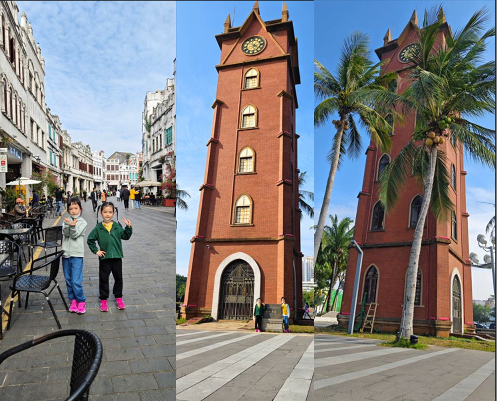 到了骑楼老街入口处就能感觉到人山人海,加之街上还有私家车摩托车更是拥挤不堪。我们走了岔道,总算人少了很多,趁机赶紧拍照留念。骑楼老街的建筑全是南洋风格,很特别,所以印象深刻。街道两侧有很多小吃店,我们选择了一家休憩下,顺便点了椰奶清补凉炒冰烤肠等算作午餐了。吃完随便再逛逛再拍拍就离开了骑楼老街,这时天气放晴了,蓝天白云椰树,这不就是心心念念的海南美景吗?趁晴好的机会让孩子们在钟楼下椰树下面合影留念!