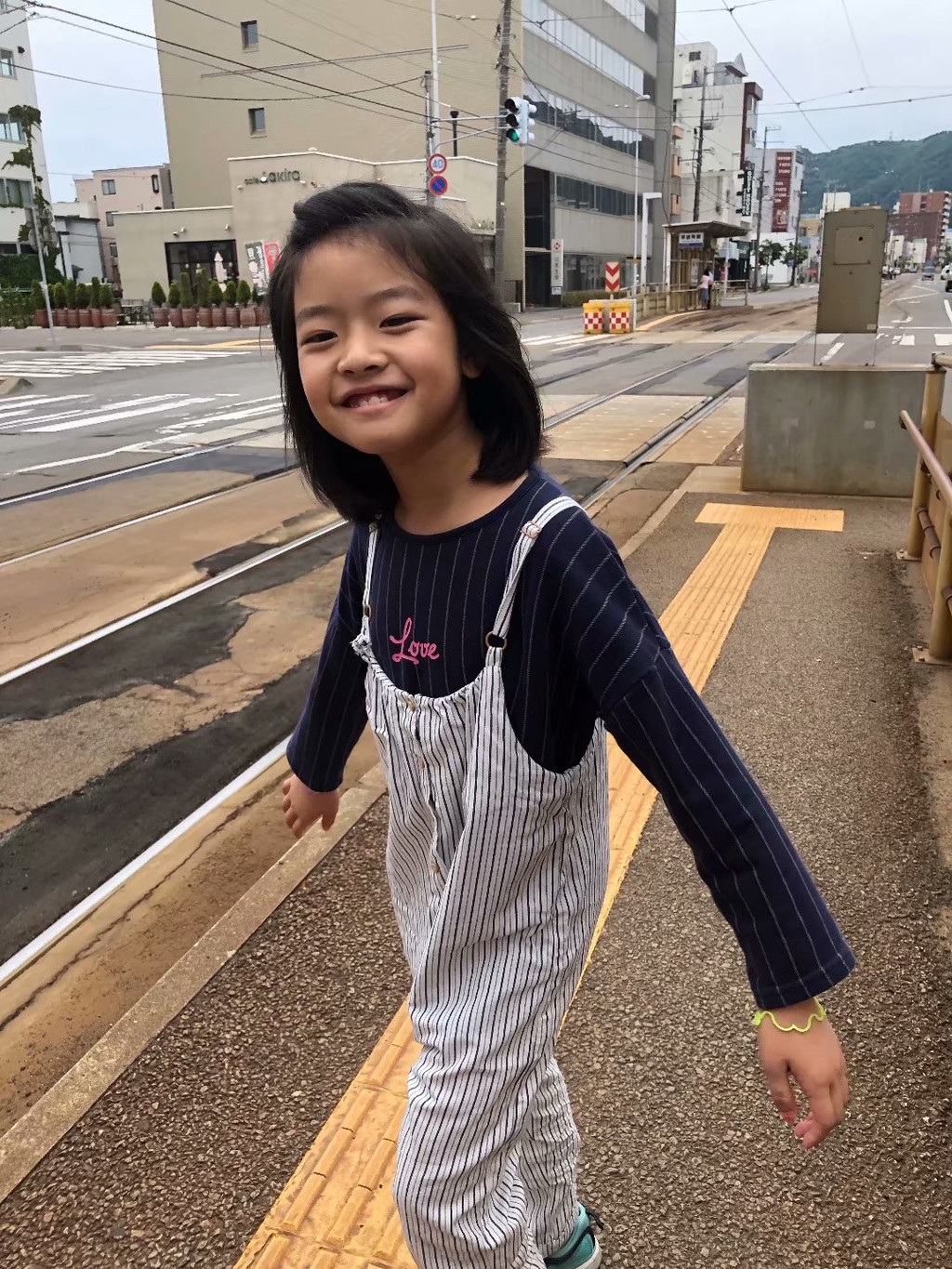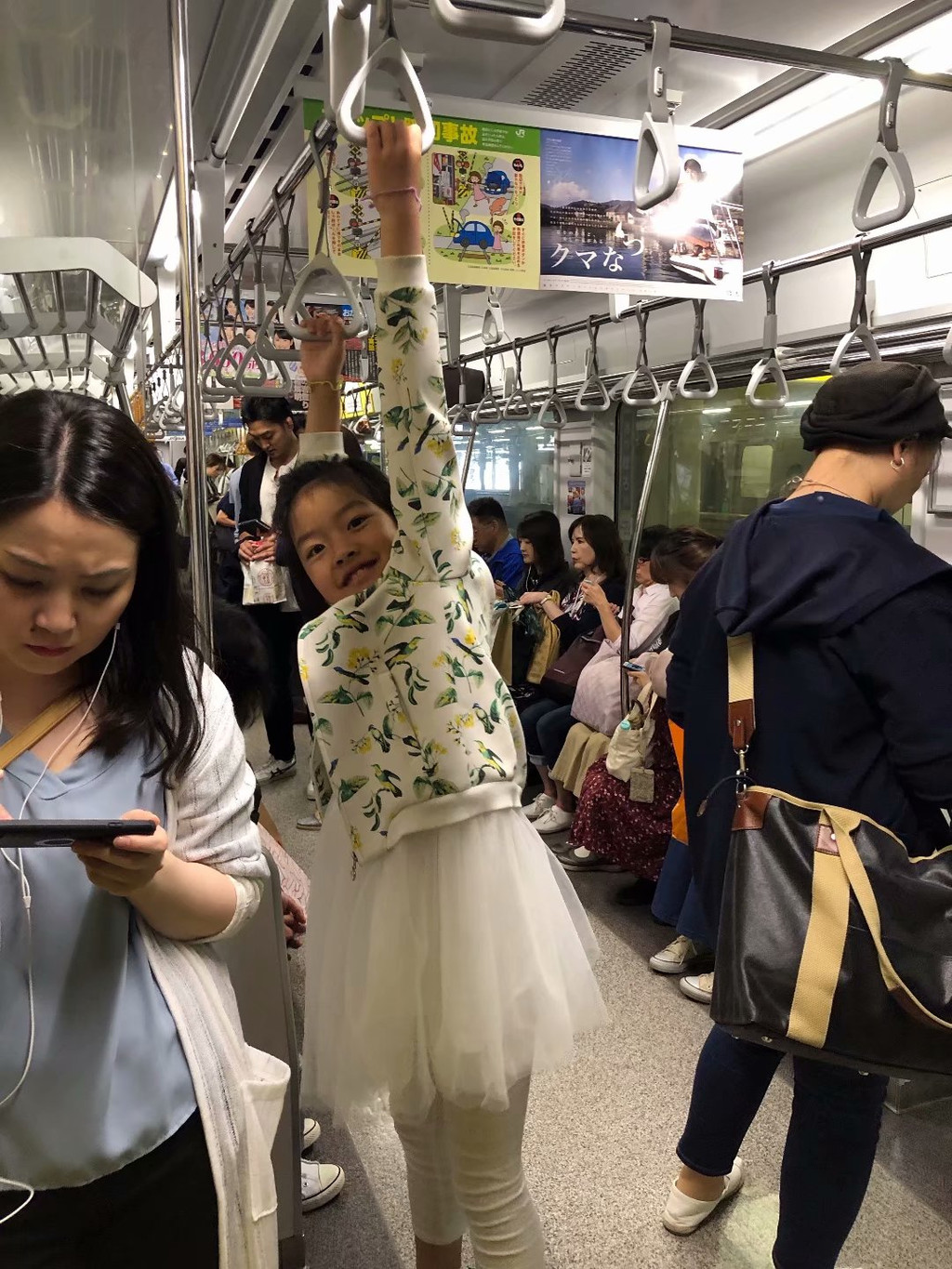 电车站都在马路中间,一不留神,坐了相反的方向,一站下来赶紧到对面换车。栗子挺嗨的,哼着歌跳着舞步。