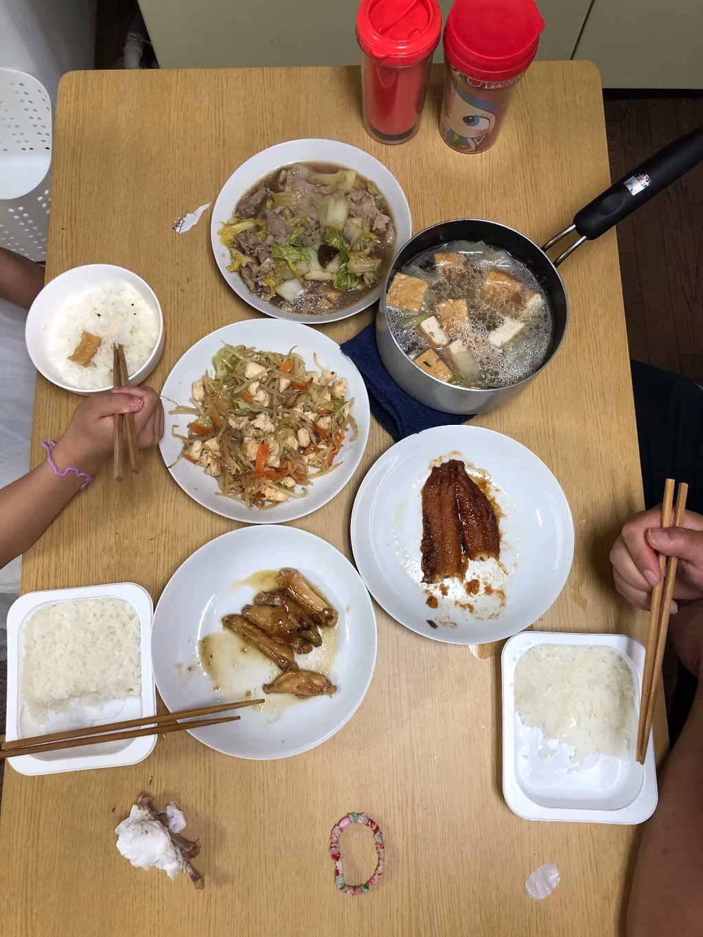 超市有煮熟的米饭,买回来微波加热就能吃;肉片也是切好的,配大白菜炒一炒;鸡翅中竟然一切两,难道是为了看起来多一些吗?一盒大概6只吧,将将够煮一盘;鳗鱼是成品,直接微波加热即可;豆芽吵鸡脯,鱼豆腐烧汤。在超市花了两千多日元,其它菜明天还能对付一顿早饭。