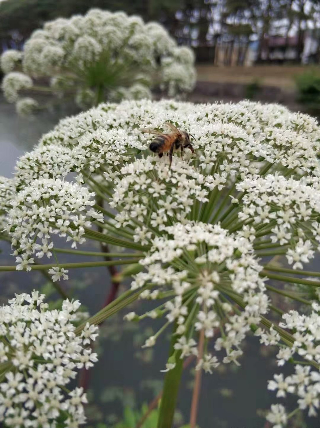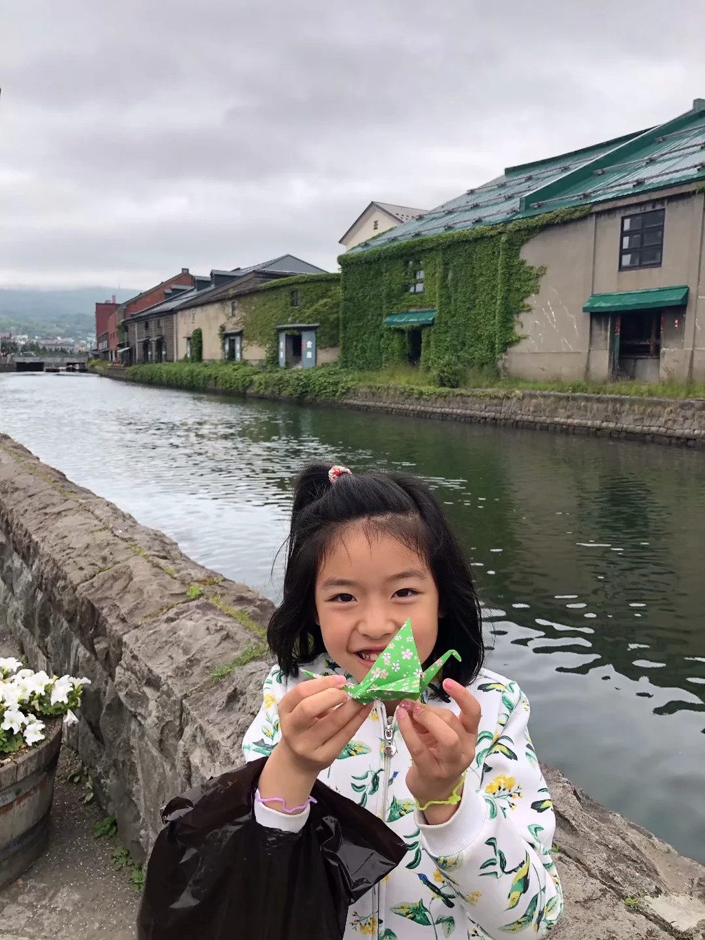 坐在运河边休息,旁边旅游服务中心的人,送栗子一只纸鹤。