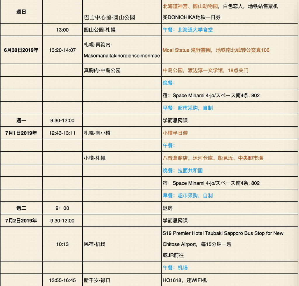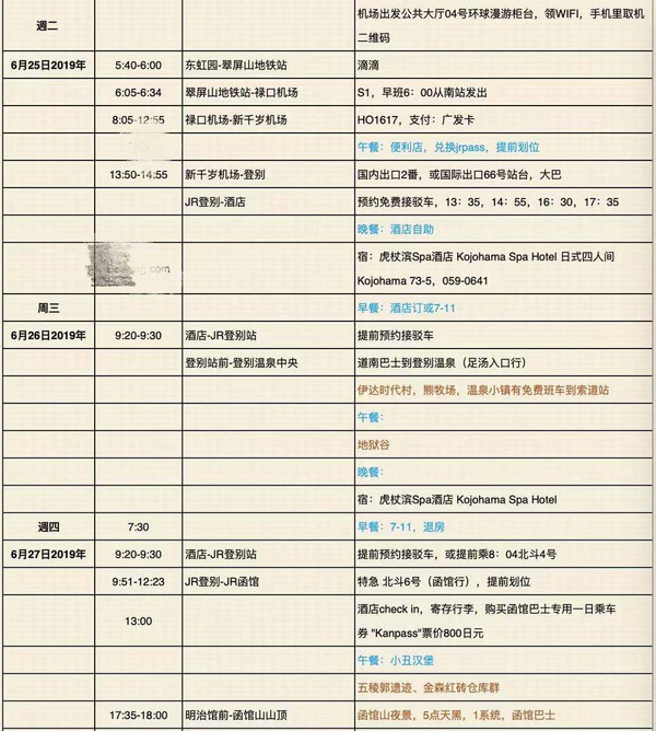 如下是每次行程前都会做的行程表,精确到每个转场的交通工具及时间点,辅助各种旅行APP,如谷歌地图,乘换案内,加上提前收藏的各景点官网,自助游便有底了。