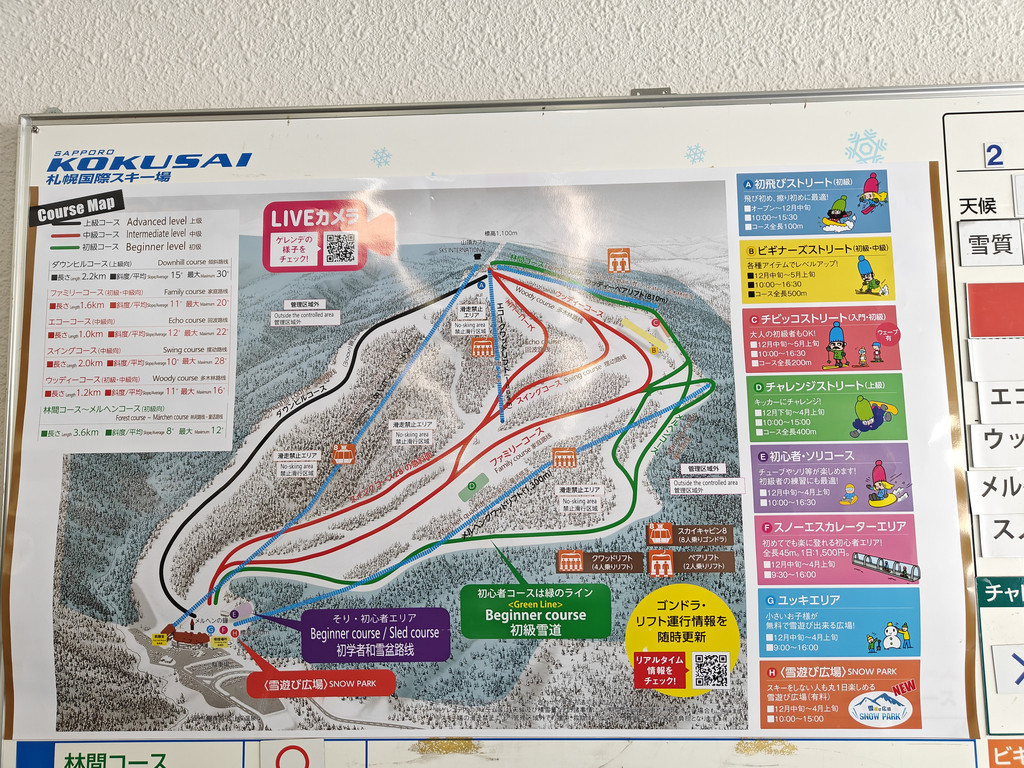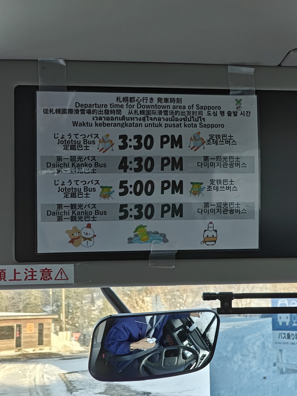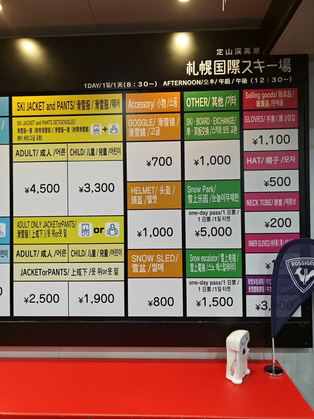札幌 国际滑雪场。 日本 的滑雪场好像都没有公交可以直到达雪场门口,最后几公里需要步行或打车,费用较高。 札幌 国际滑雪场有专用巴士在市内几个站点接送。车次和停靠站见图1。我是从 札幌 巴士总站9站台上的,车上已经基本满了,只能坐边座。所以保险起见最好在前面几个站点上车。单程车票1300円,可以买往返票➕一日缆车套票6000円。到雪场后现在地下一层填表(主要是个人信息,单双板,鞋号,只租鞋、雪板、手杖,还是包括雪服头盔),然后到收款处交钱。拿单子领装备。到更衣室换衣服,更衣室有存衣柜,400円一次,锁上了打开就算一次。换好装备到进雪场,进雪场后再买滚梯票或者缆车票,滚梯票全天1500円。看了一下,很短的一段,没啥意义。缆车票全天5000円,如果➕980円的午餐券合计5500円。一次390円,4小时3900円可以根据自己的技术选择。买完缆车票会给一张卡,过缆车闸门的时候,自动感应。我这初级中的初级,从山顶连滚带爬的下来需要一个多小时。早知道买次数最合适。虽然从山顶、半山腰下来都有初级道(绿线),但中间也有几处陡坡,大的转弯。摔出了各种姿势。滑雪结束,先更衣室换衣服,退装备。一定要带干的内衣。雪服雪裤也应该有,否则衣服裤子都是湿透的,不知是雪水还是汗水。服务中心旁有自动退卡机,把缆车卡放进去,自动退500円押金。返程车就在滑雪中心门口右侧。第一次这种雪场的体验,痛并快乐着。同时浪费了不少钱。