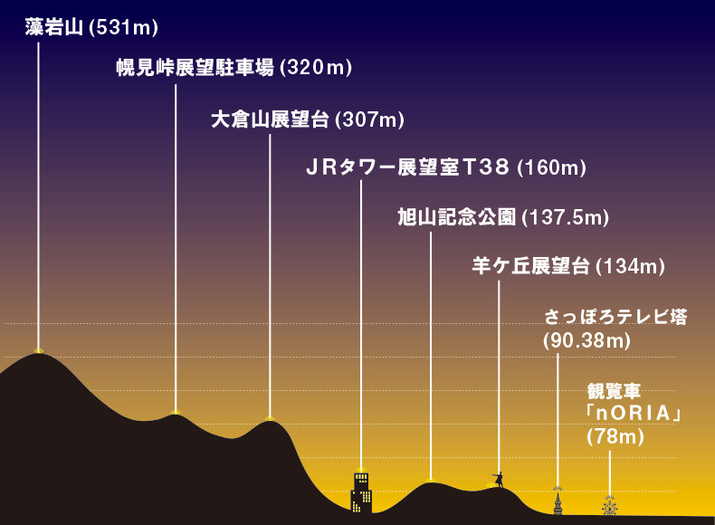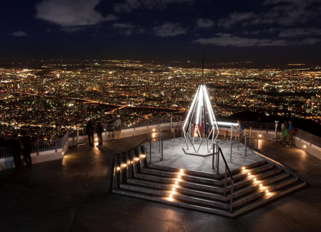 这座城市的特点是有许多观景点,因为周围被群山包围,所以从山上可以充分享受到充满尺度感的大全景。您可以从不同高度鸟瞰,例如藻岩山(531 米)、大仓山(307 米)、JR 塔(160 米)、旭山纪念公园(137 米)和札幌电视塔(90 米)。特别是藻岩山的夜景魅力,这座拥有 200 万人口的大都市,横跨北海道广阔的土地,被称为“光之地毯”和“闪闪发光的珠宝盒”,给许多参观的游客留下了深刻的印象。
