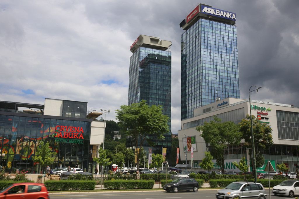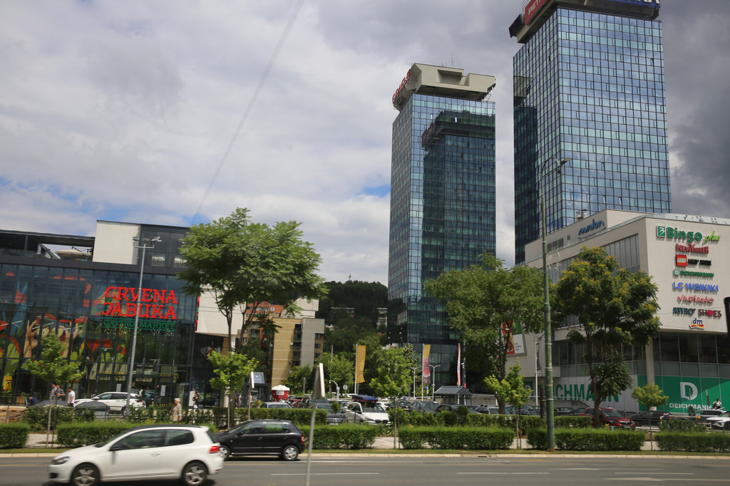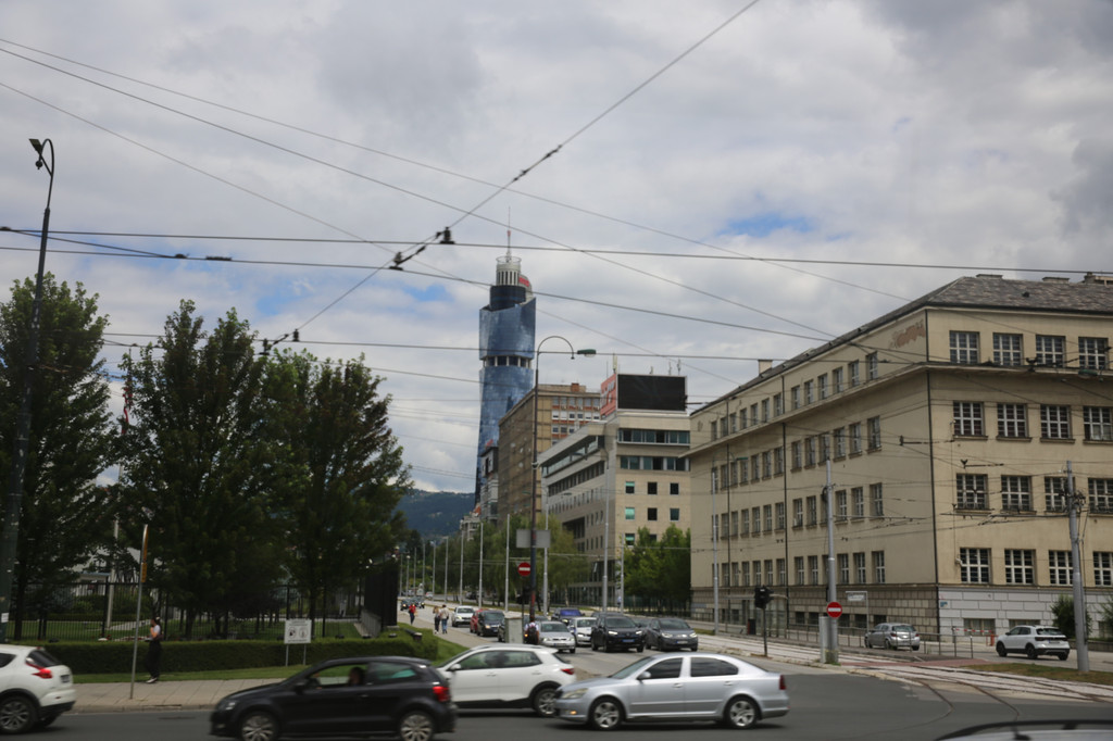 最里面的这座塔楼高176米,由当地的建筑师设计,是一座现代化的摩天大楼。它的外观非常独特,塔楼的外表呈现出一种扭曲的形态,因此得名为“扭曲塔楼”。这座塔楼是一个多功能建筑,包括办公室、商业空间、餐厅和观景台。在塔楼的顶处,可以欣赏到萨拉热窝市区的全景。