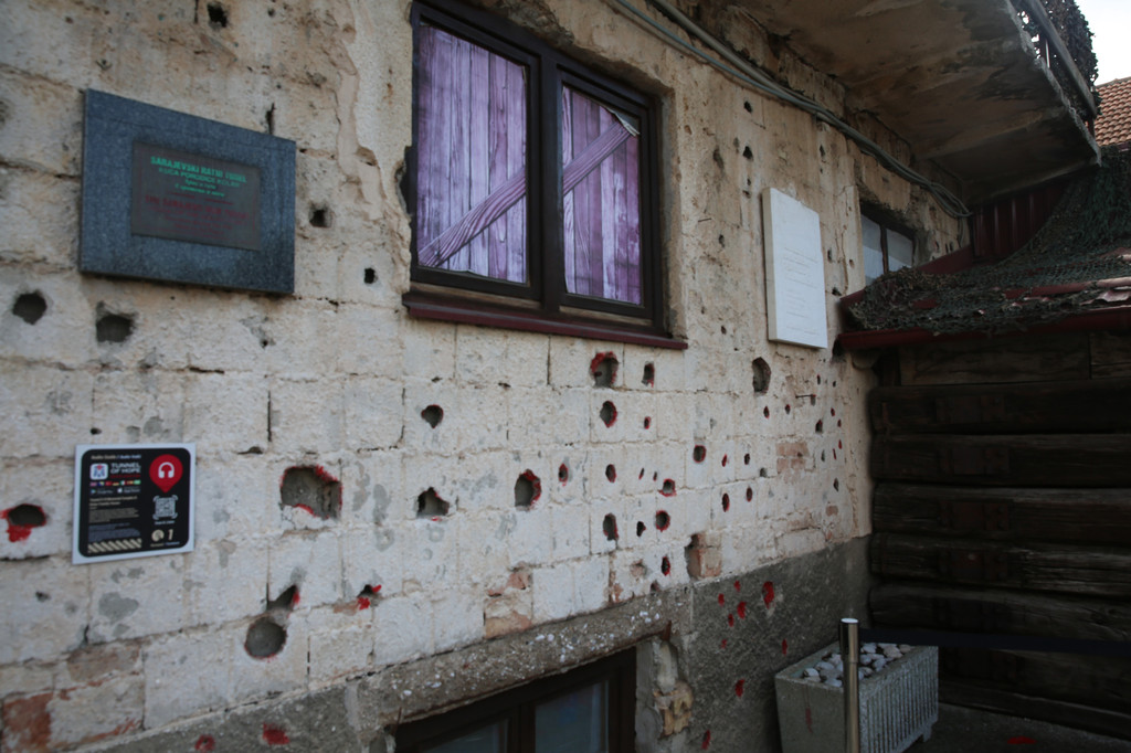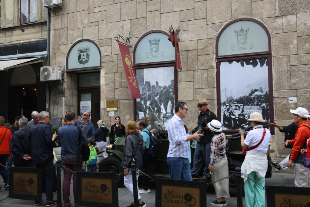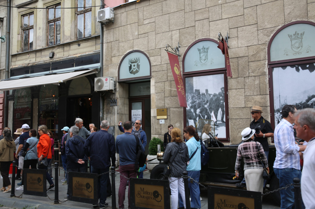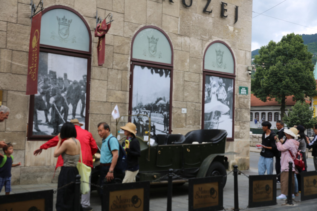 建筑的铭牌上写道:1914年6月28日,奥匈帝国皇储斐迪南夫妇在此桥附近被暗杀,从而引发了第一次世界大战。就在这个转角,当年的小店如今成了刺杀事件的博物馆,