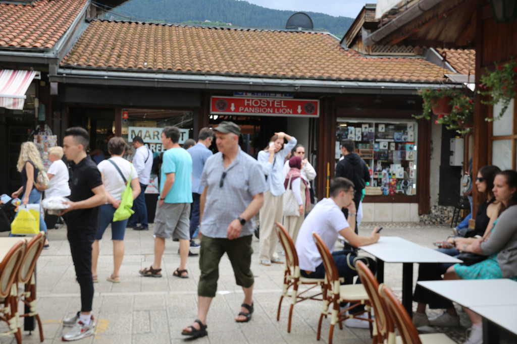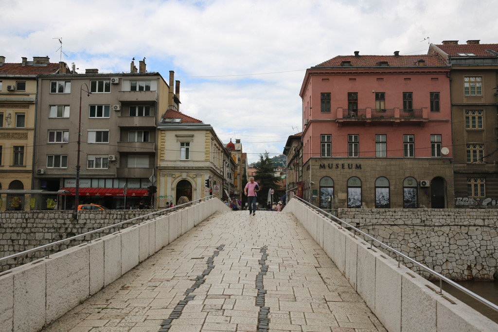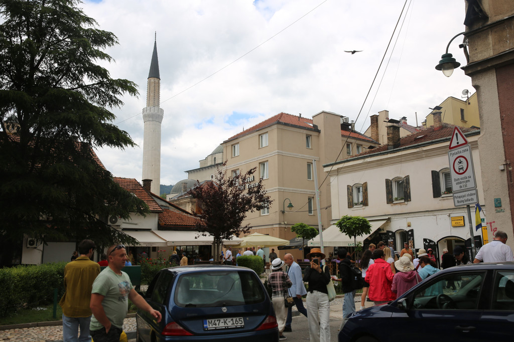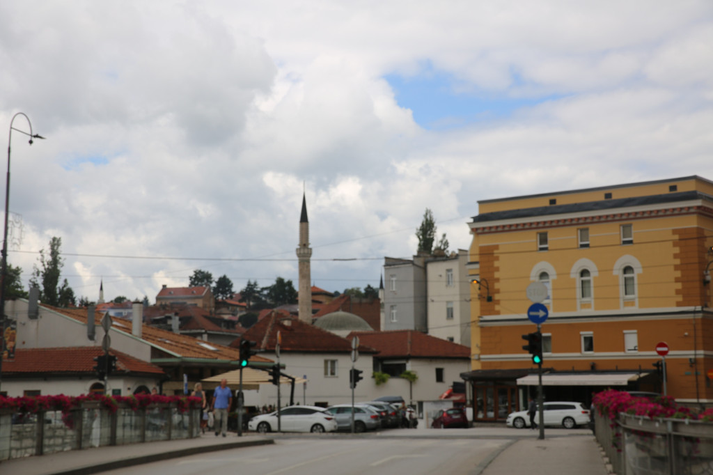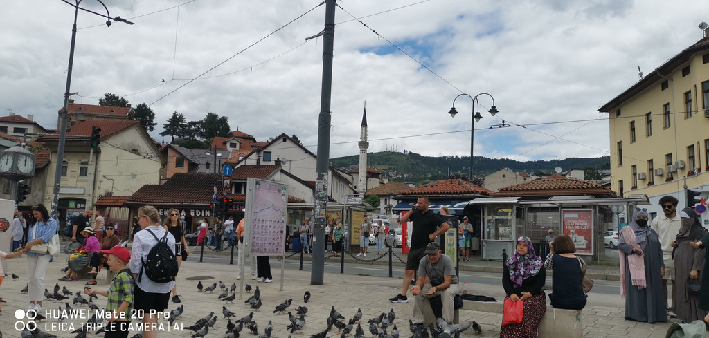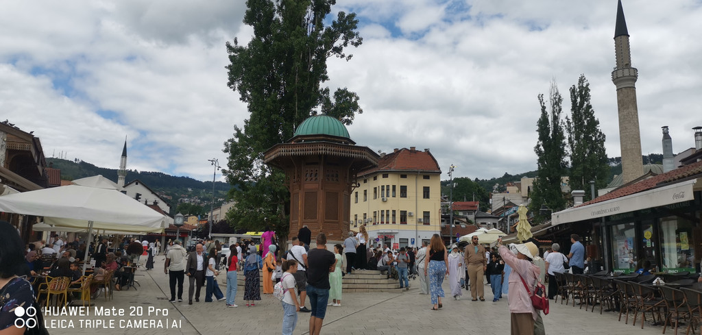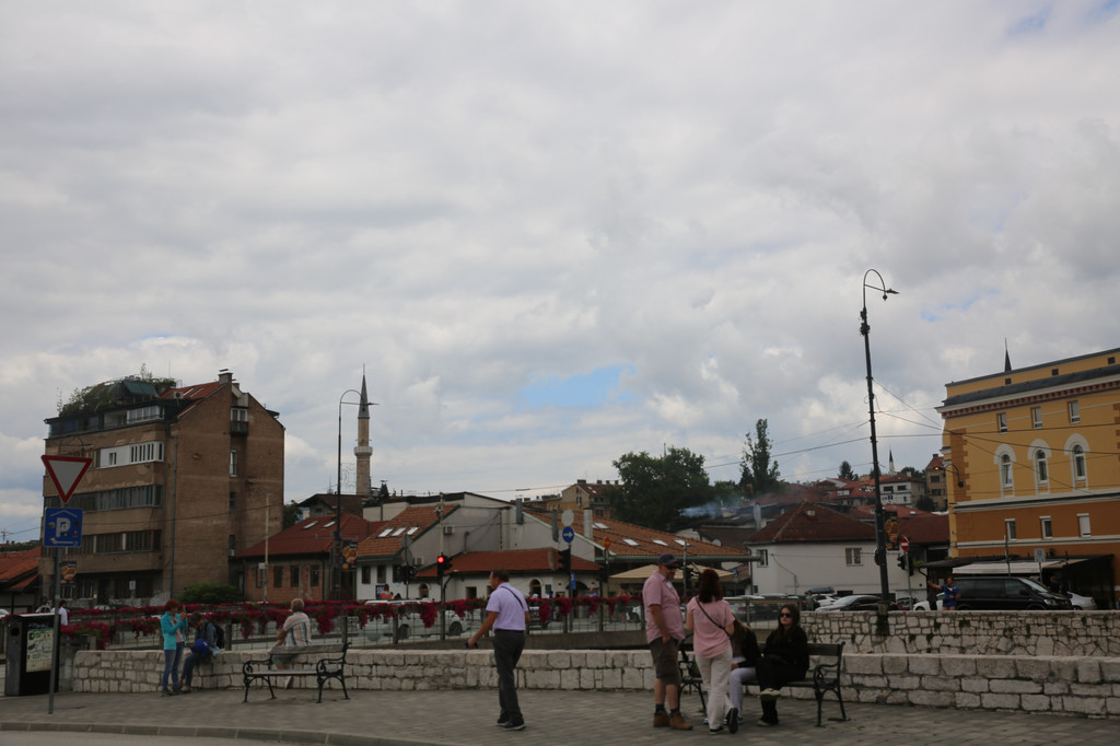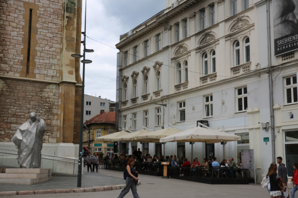 过牧羊人大桥,来到河对岸的广场。市政厅河对岸的广场叫巴斯特广场(Place Pasteur)。这个广场也是萨拉热窝的一个热闹之地,周围都是餐馆与酒吧,藏在错综复杂的小巷里面,是萨拉老城区的一个标志性地点。