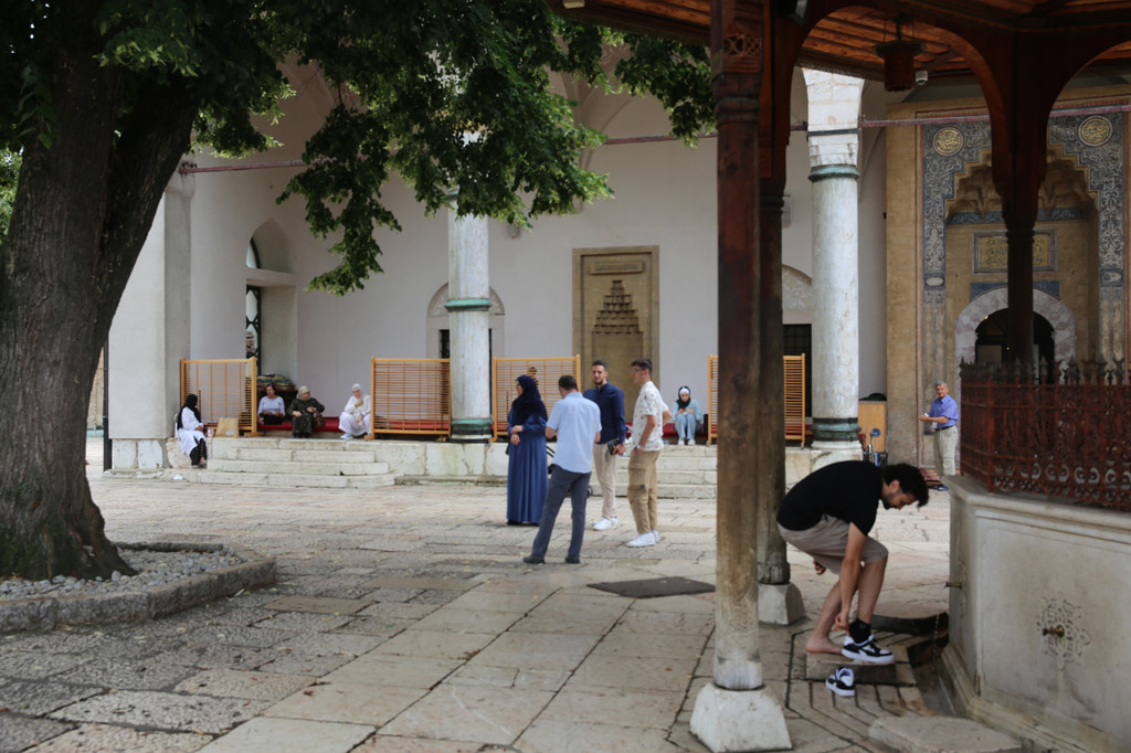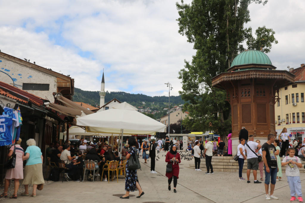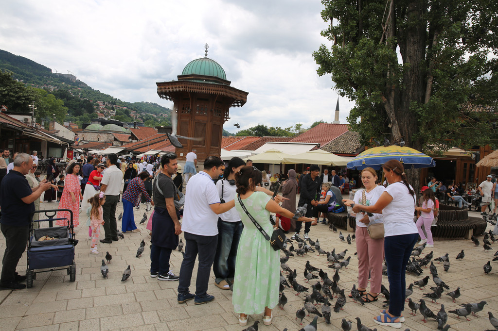 萨拉热窝曾经有许多亭形公共喷泉,据说是土耳其人带来的习俗,亭子里的供水人,领取国家发给的工资,每日向口渴的路人免费供水。而今仅存的一个喷泉亭就在巴什察尔希亚广场中心,周围店铺林立,大树葱茏,满地的鸽子起舞,已经成了萨拉热窝老城的象征。