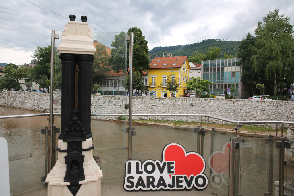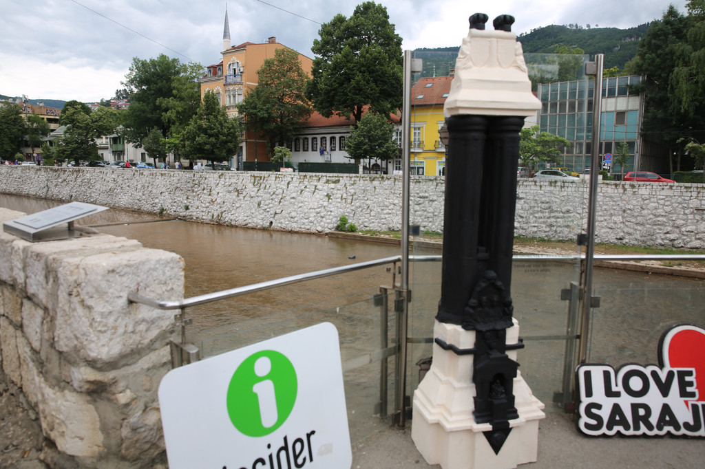 拉丁桥的桥头两边是将普林西普视为反抗奥匈帝国统治的民族英雄修建的纪念碑和另一边的石椅是仿效费迪南大公和索菲亚乘坐的汽车座位修建的。
