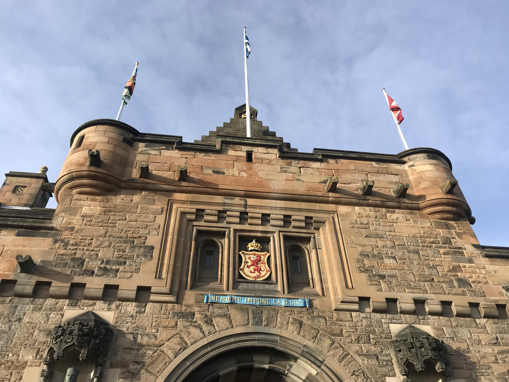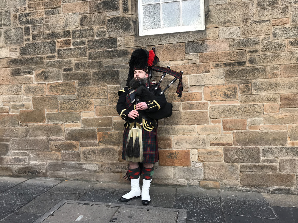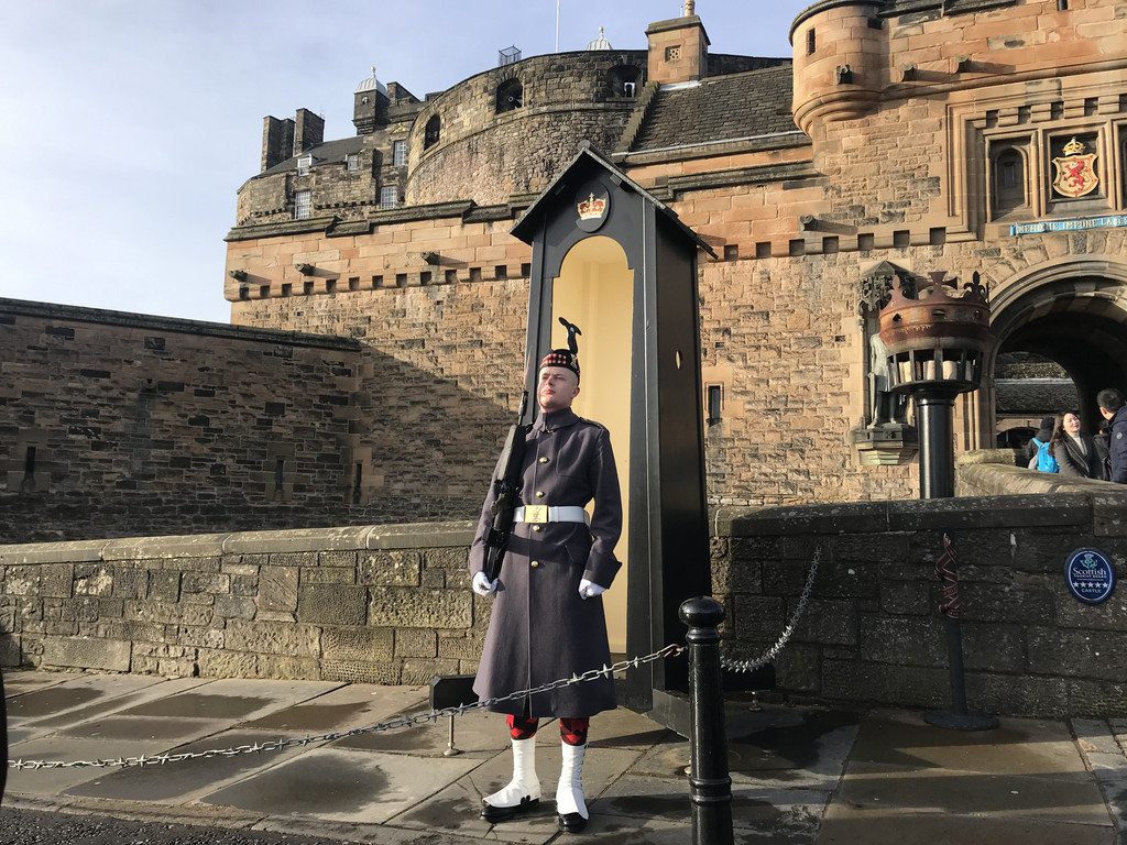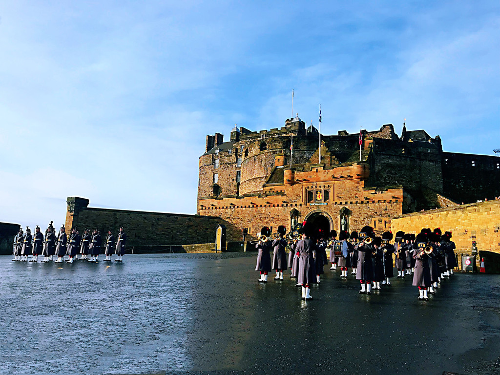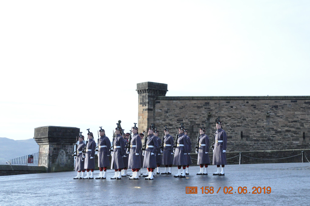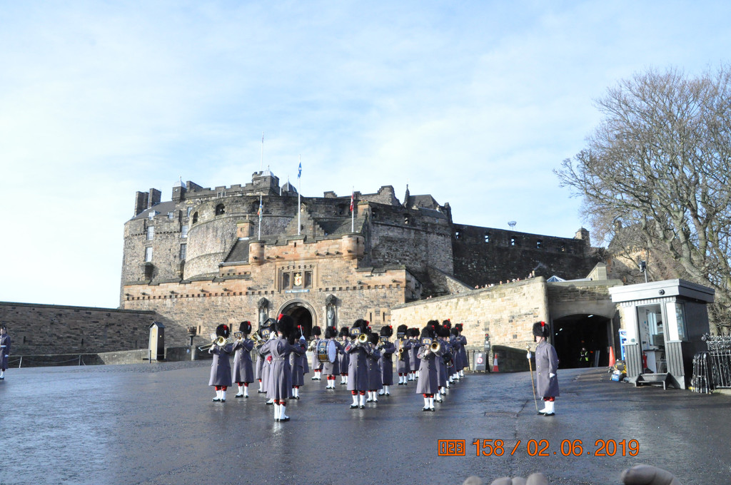 我们在爱丁堡游玩完全靠走,一天走下来游完四个景点也就约两万步,由此可见这个城市确实不算大。古堡位于一座小山包的顶端,三面临悬崖峭壁(说悬崖峭壁略显夸张),我们到达古堡时恰逢苏格兰皇家卫队举行换防交接仪式,整个皇家仪仗队身穿浅灰色大衣、乐队头戴黑色熊皮帽、卫队头戴羽毛头箍,小腿裹着一条红黑格子纹的苏格兰羊毛巾,脚穿黑皮靴、外包一块白牛皮,整个仪仗队看着谈不上威武雄壮,但倒也别具特色,跟中国的仪仗队相比不可同日而语。爱丁堡城堡规模不小,古堡的外城墙上是炮台,里面有战争博物馆、盔甲冷兵器展览馆、教堂等等,站在古堡的城墙上能俯瞰整个爱丁堡。