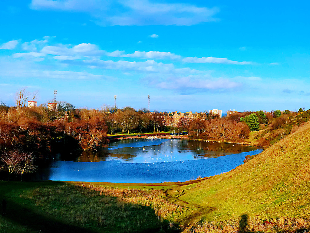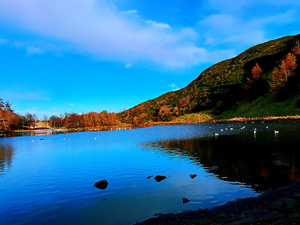 亚瑟王王座其实只是一座山,前往亚瑟王王座沿途并没有很明显的标识,山虽不高但由于道路并没有修缮,所以要登山也并不轻松,我在离登顶约三分之二处放弃了继续前行,原因是冬天爱丁堡的风实在有点大,况且山顶也并没有什么遗迹、遗址。不过去往亚瑟王王座的路上倒是很美,大片的草地即便是在寒冷的冬天也绿草如茵,山脚下一处平静的小湖里栖息着成群的海鸥在自由翱翔。