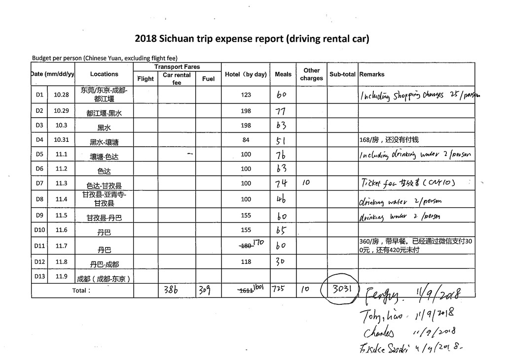 人均费用(不含来去四川的交通):3,031 元,其中住宿费1,601元,餐费725元,门票10元,租车费386元,油费和过路费309元。